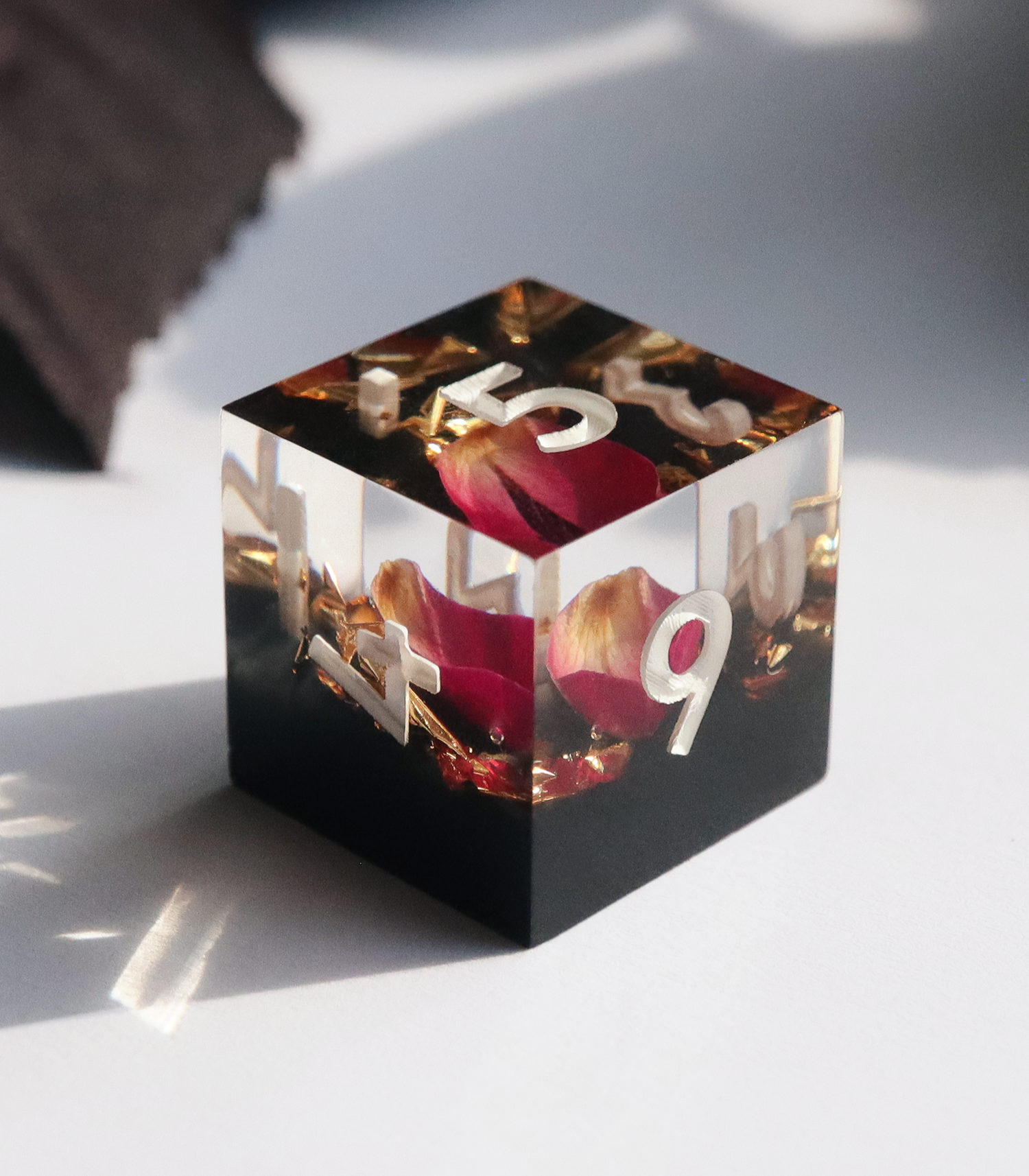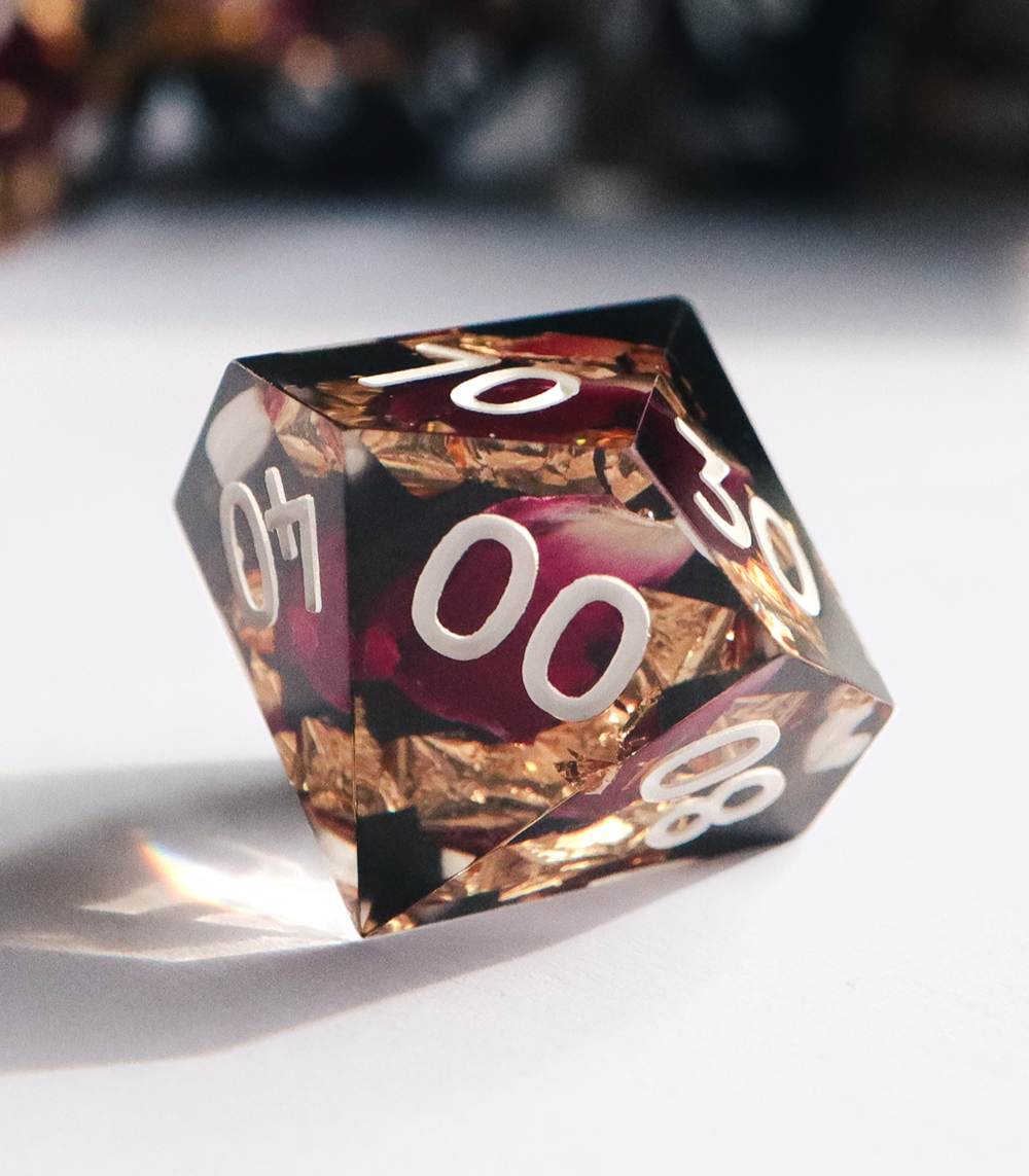 A half clear, half black design with real rose petals and gold foil. This set includes one D4, D6, D8, D10, D%, D12, and D20.