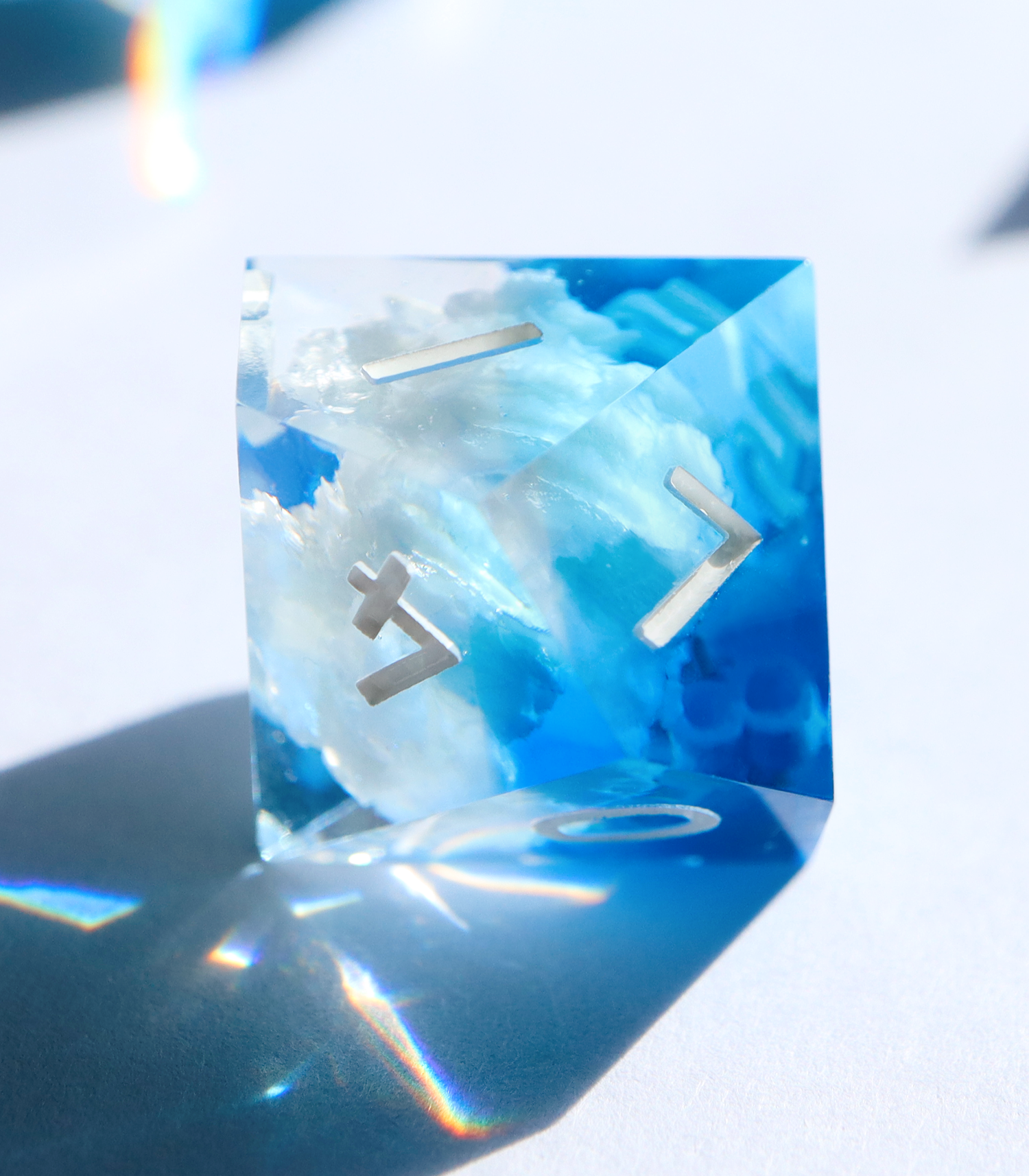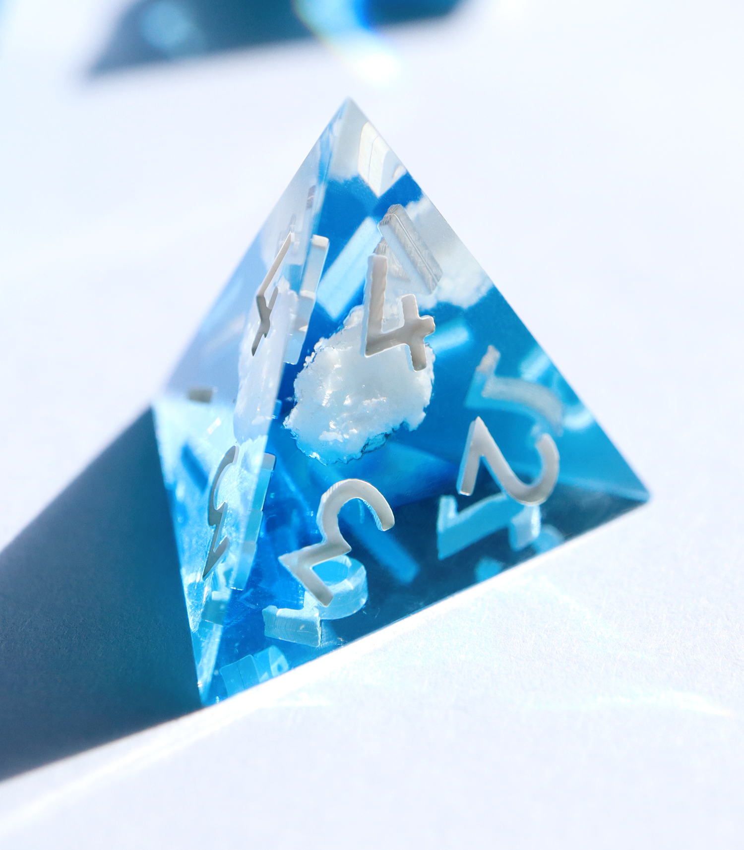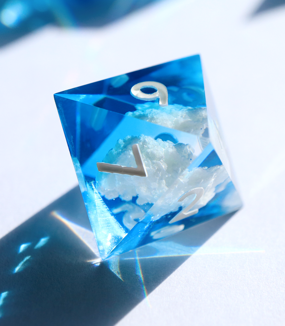 A bright clear, blue set with cloud inclusions, bright and optimistic. This set includes one D4, D6, D8, D10, D%, D12, and D20.