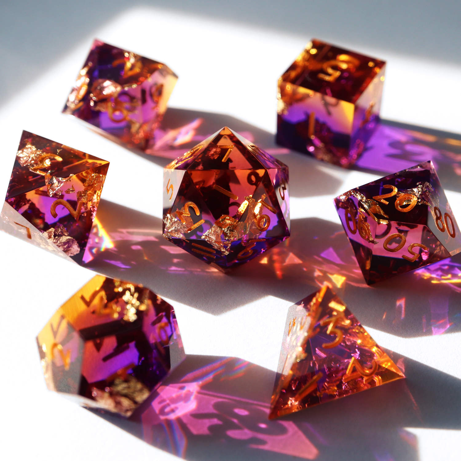 A colorful supersaturated gradient design with gold foil. This set includes one D4, D6, D8, D10, D%, D12, and D20.