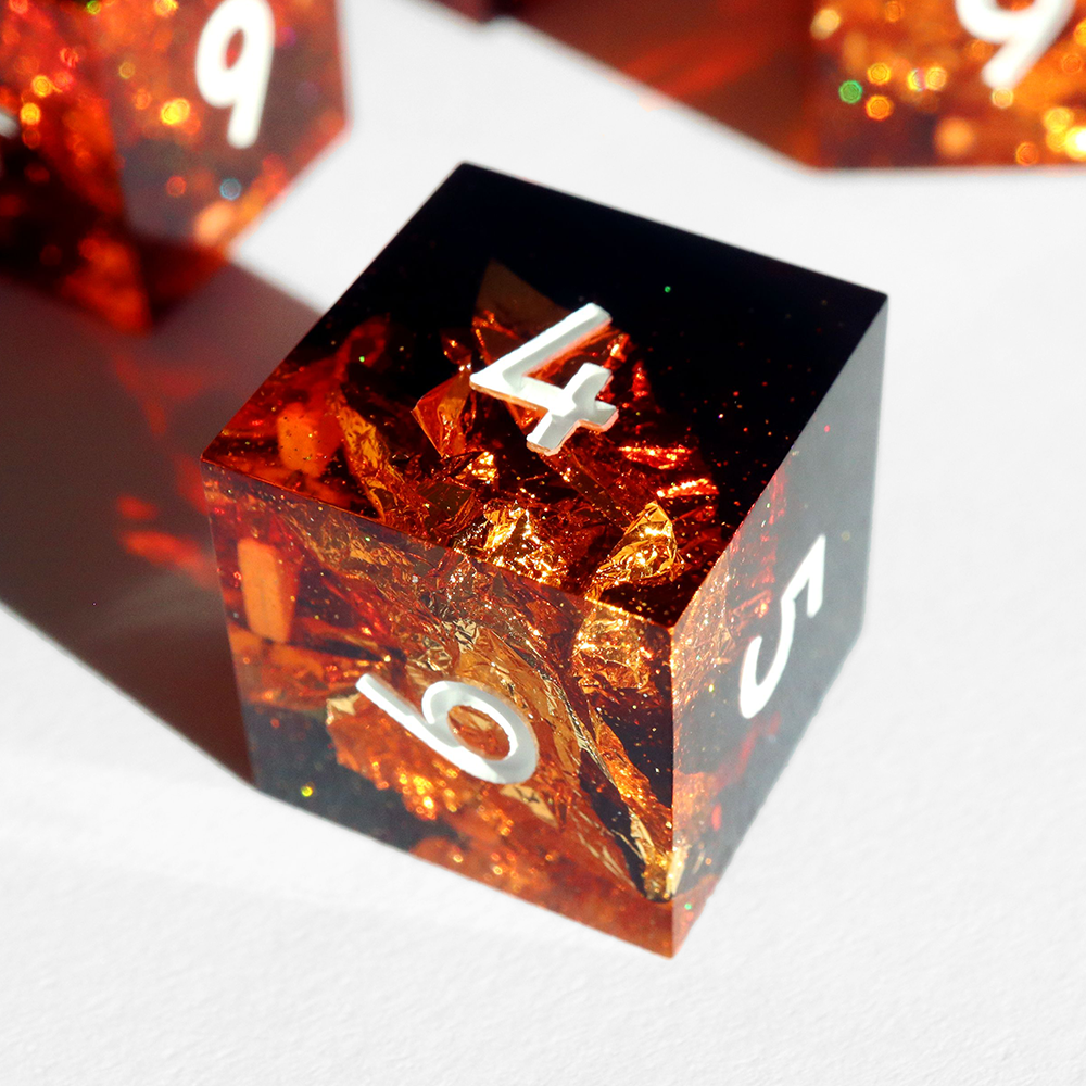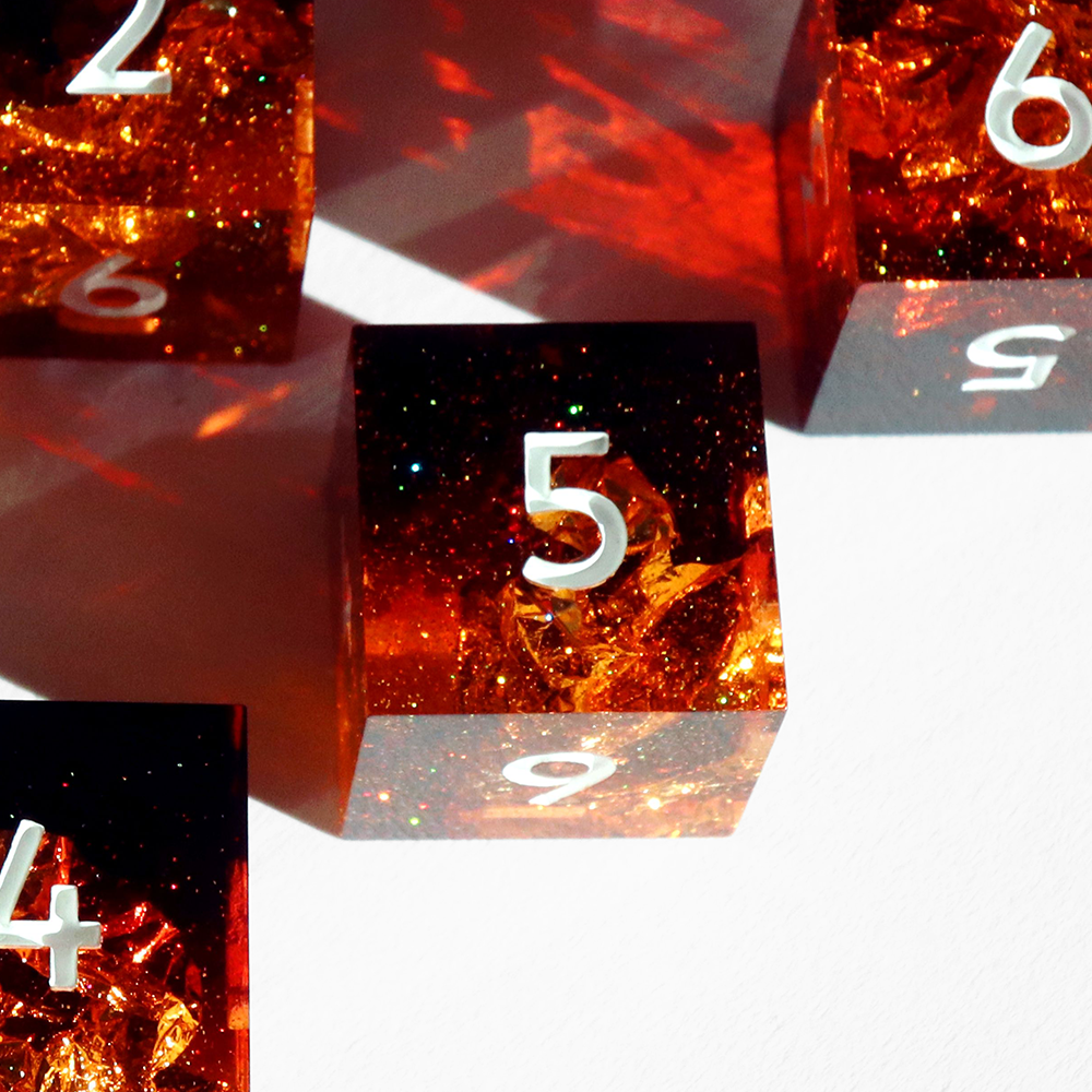 All sets sold by Everything Dice are handmade by our team of skilled resin artists, and quality-inspected to be visually perfect and suitable for casual play. Because of the handmade nature of our dice, each set will vary slightly in color proportions and gold flake placement.