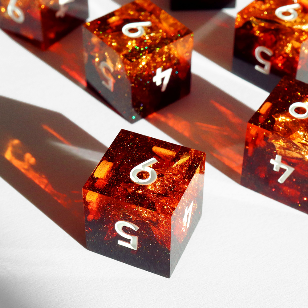 A set of 6d6 dice in the Fireheart design.