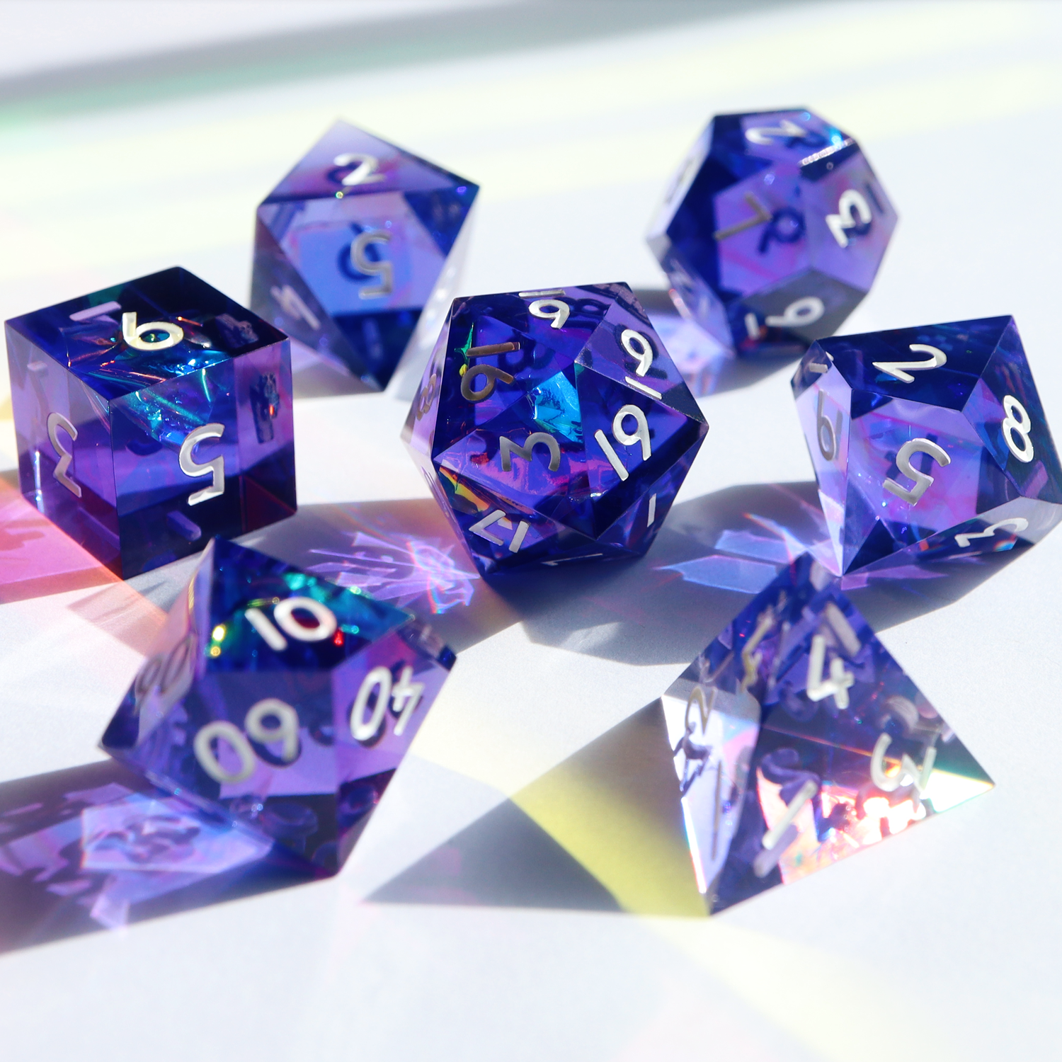 A brilliant, flashy design featuring holographic paper in purple resin, inspired by 80s retrowave design. This set includes one D4, D6, D8, D10, D%, D12, and D20.