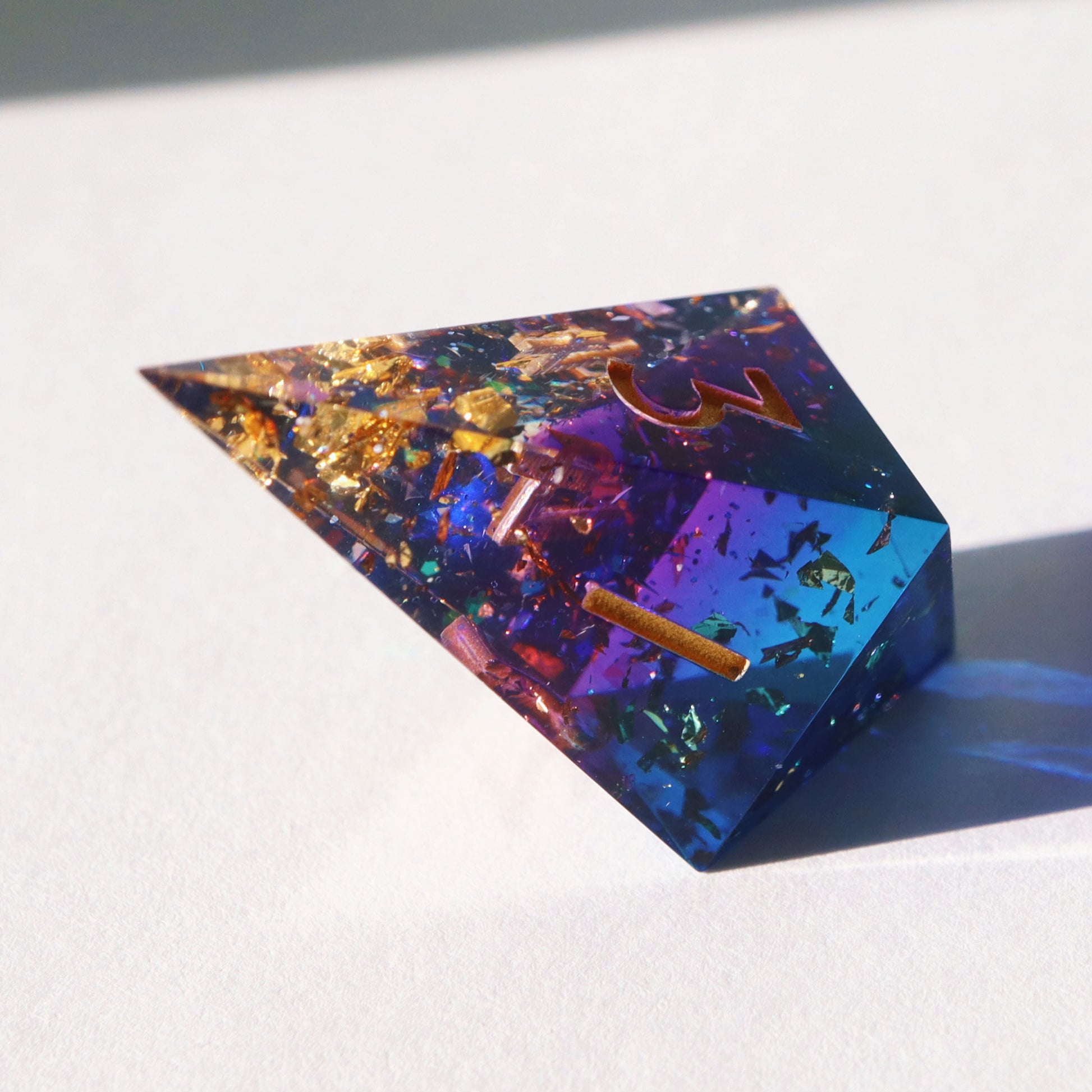 A blue-purple set with gold foil and holographic inclusions that glitter in all lights. This listing is for ONE single Crystal D4.
