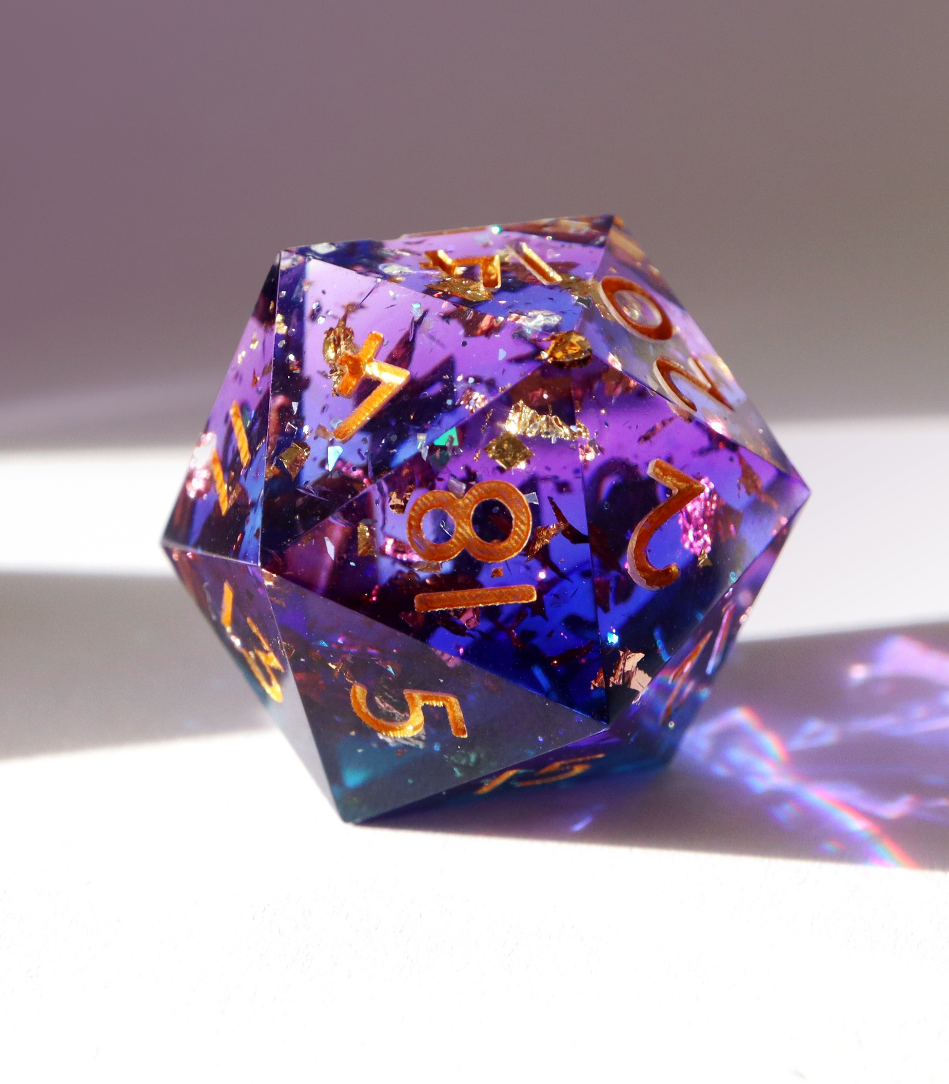 All sets sold by Everything Dice are handmade by our team of skilled resin artists, and quality-inspected to be visually perfect and suitable for casual play. Because of the handmade nature of our dice, each set will vary slightly in color proportions and inclusion placement.