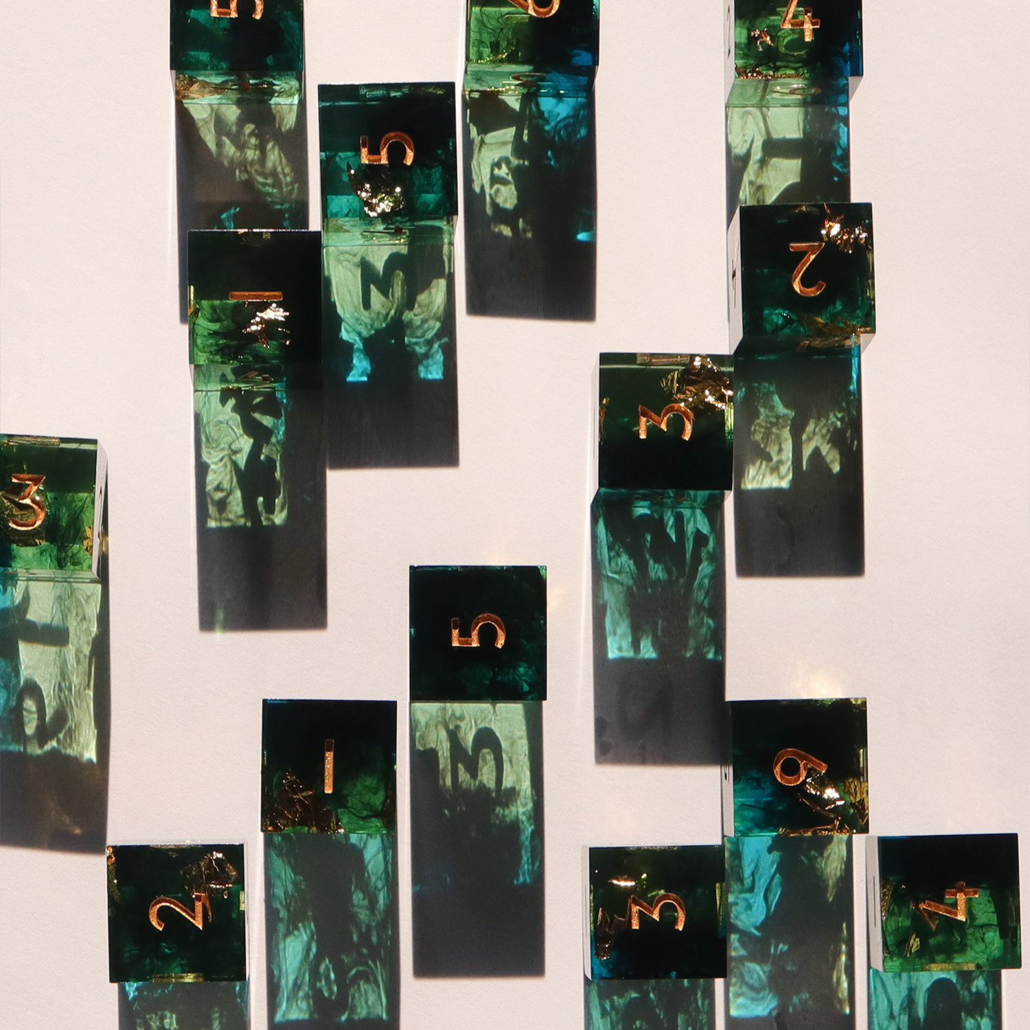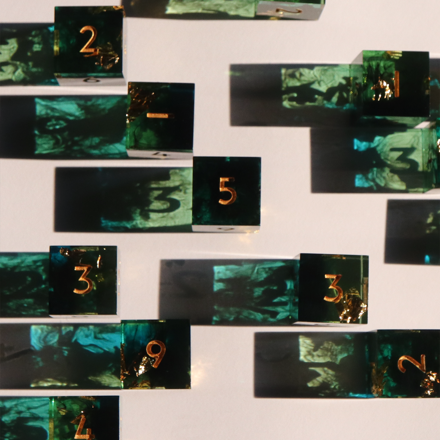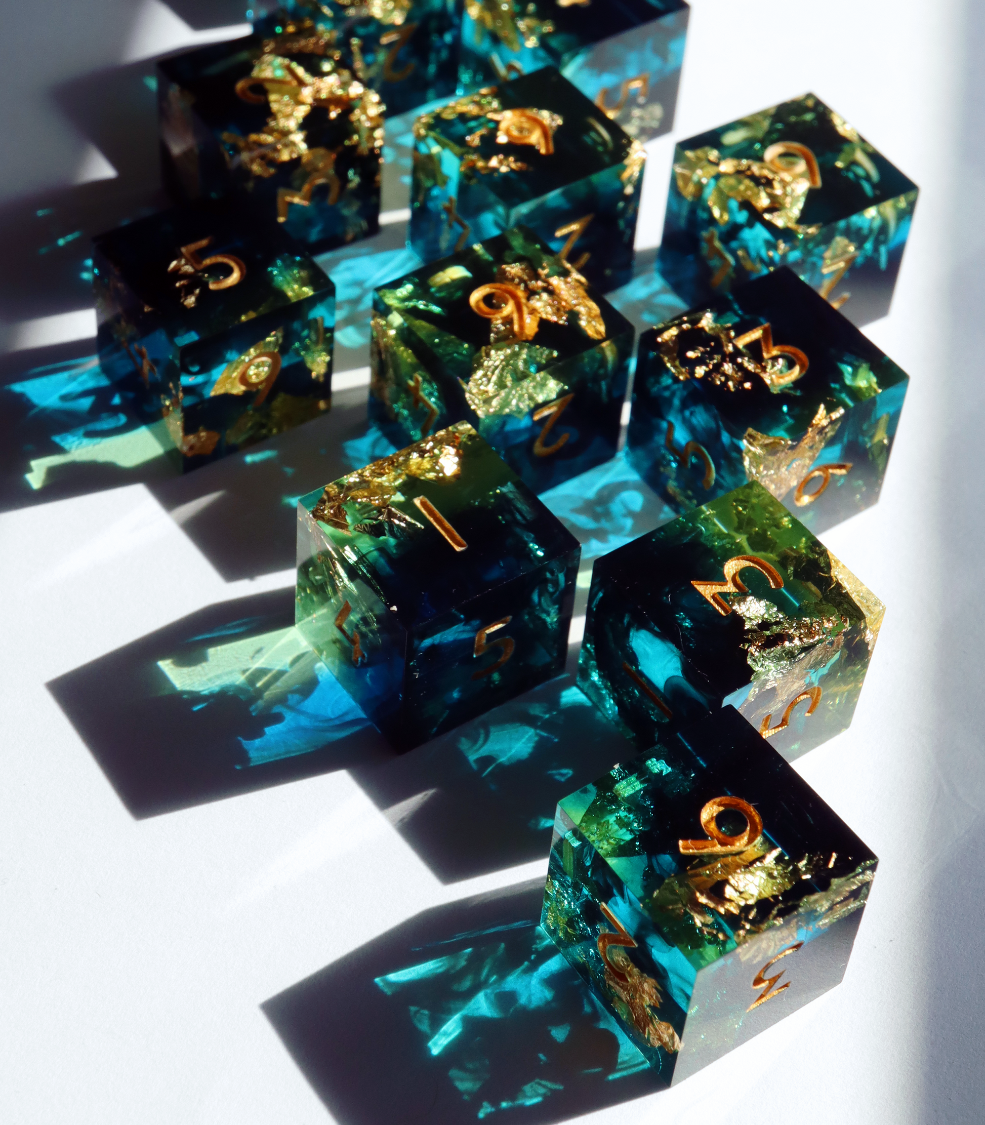 An elegant green, blue, and black smoke design with golden flake accents, inked in shimmery gold. This set includes six d6 dice.