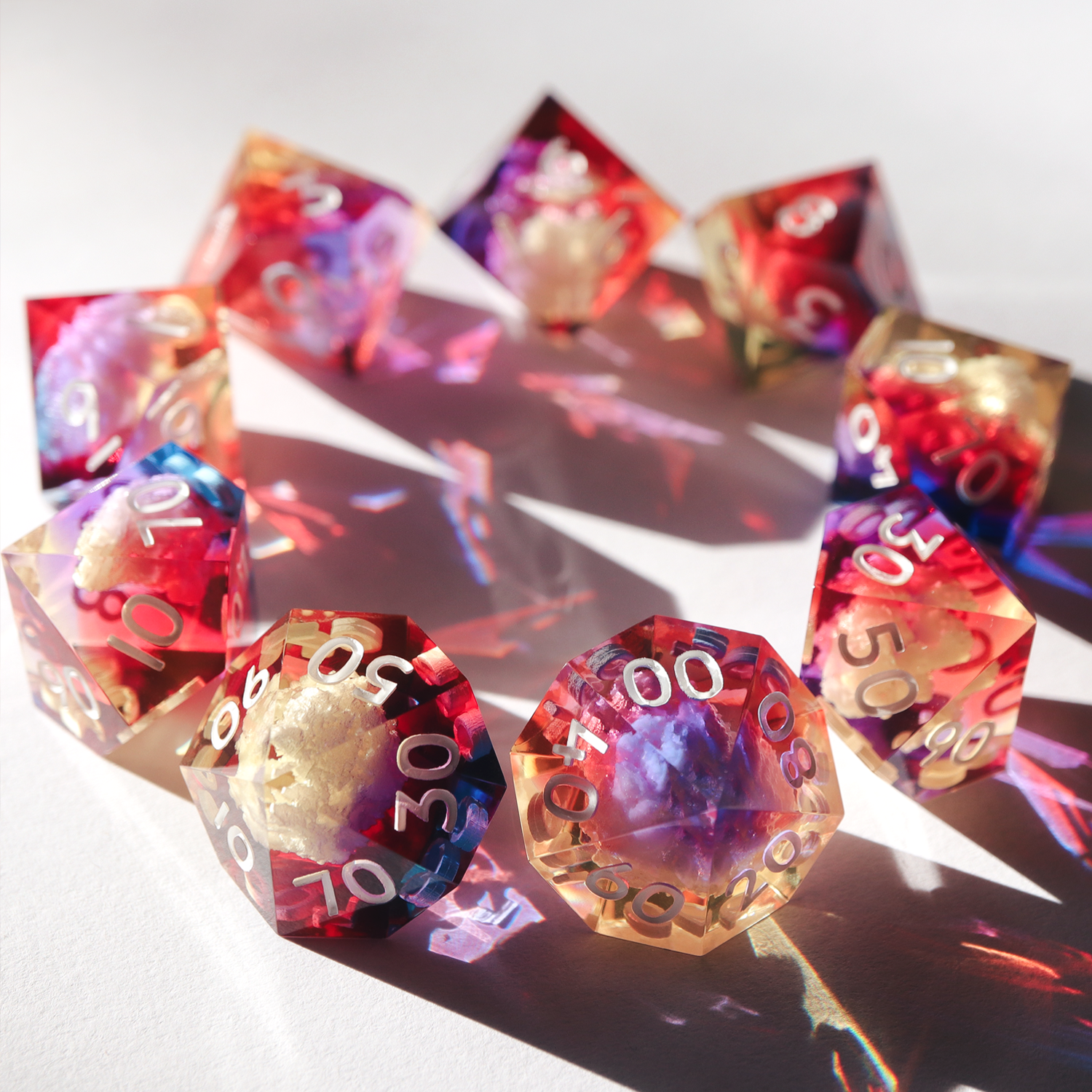All sets sold by Everything Dice are handmade by our team of skilled resin artists, and quality-inspected to be visually perfect and suitable for casual play. Because of the handmade nature of our dice, each set will vary slightly in inclusion placement and gradient ratios.