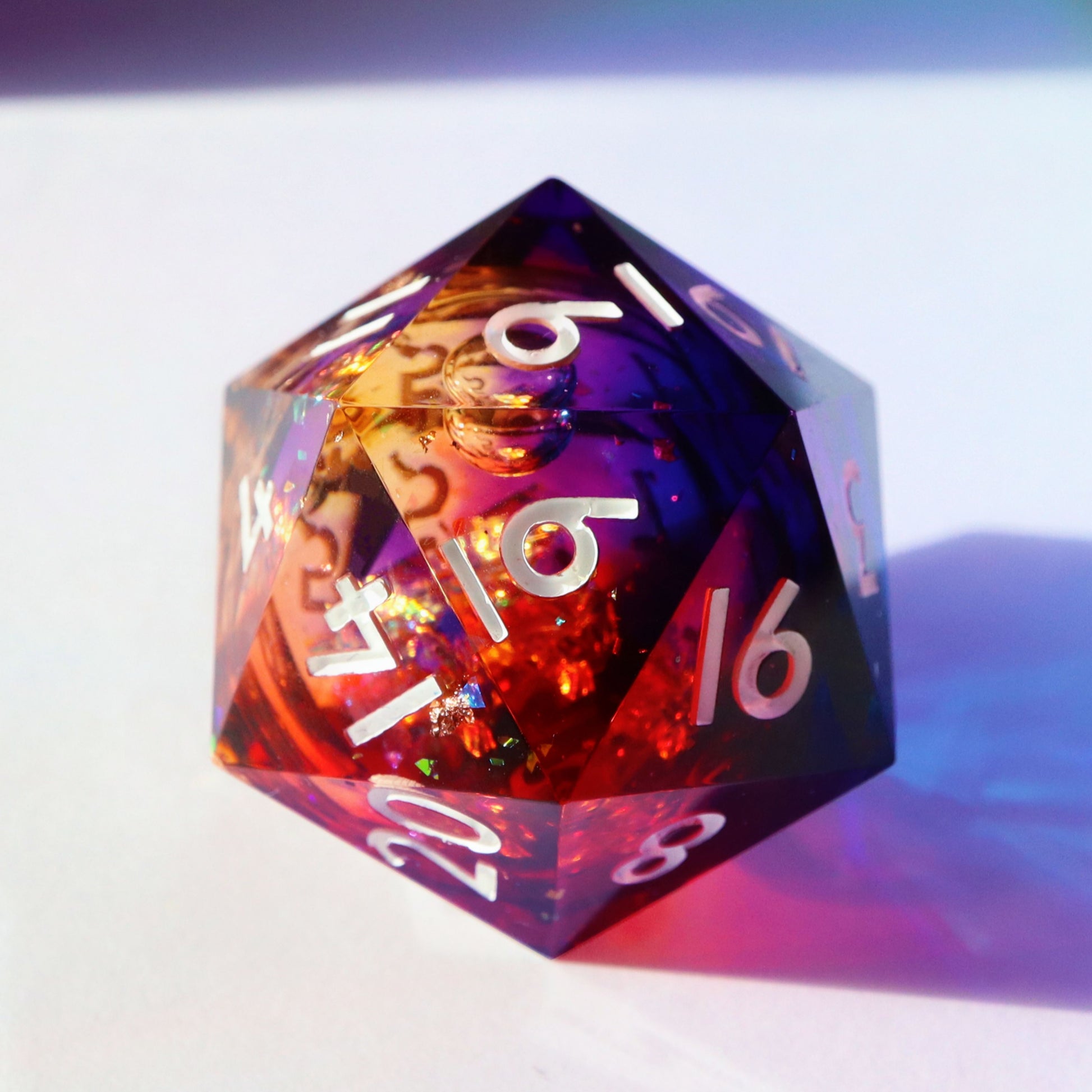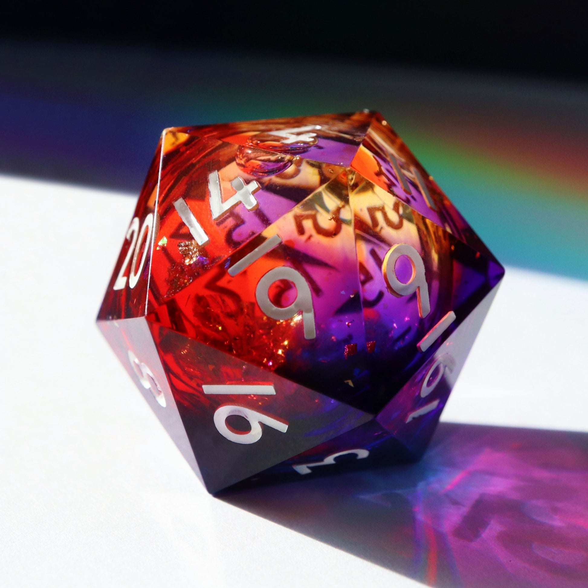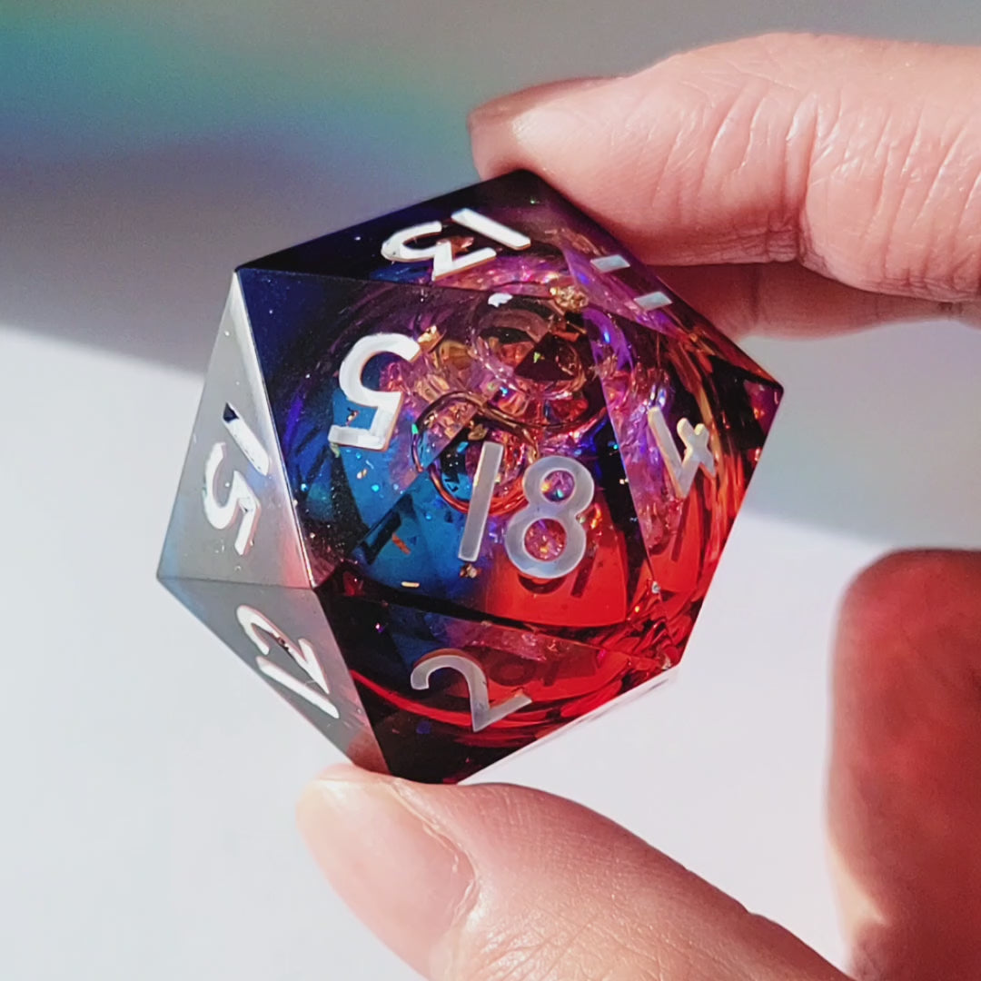 A warm sunrise liquid core design. This is an oversized chonky 40mm d20, twice the size of a normal d20! The video shows the dice both in sunlight and standard room lighting.
