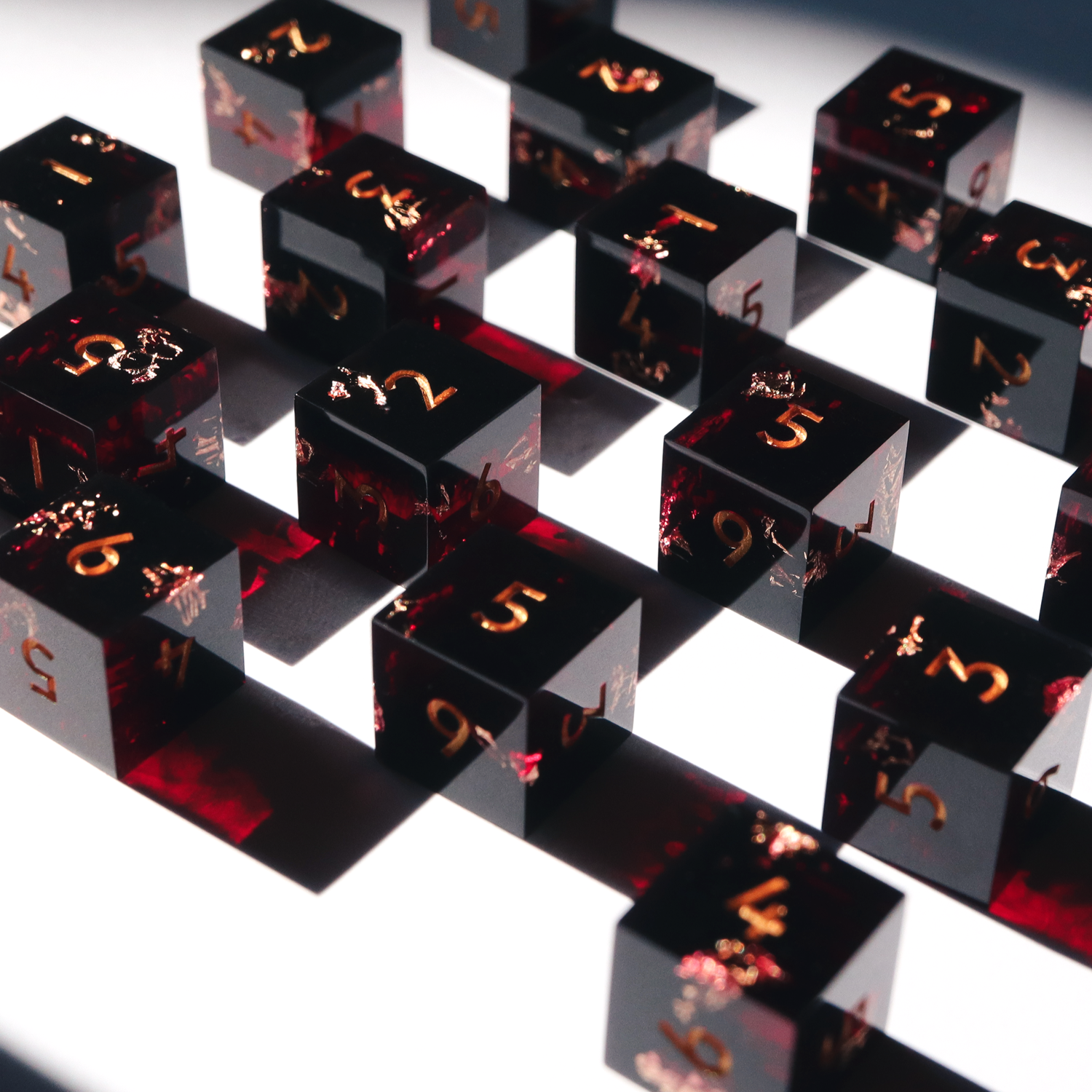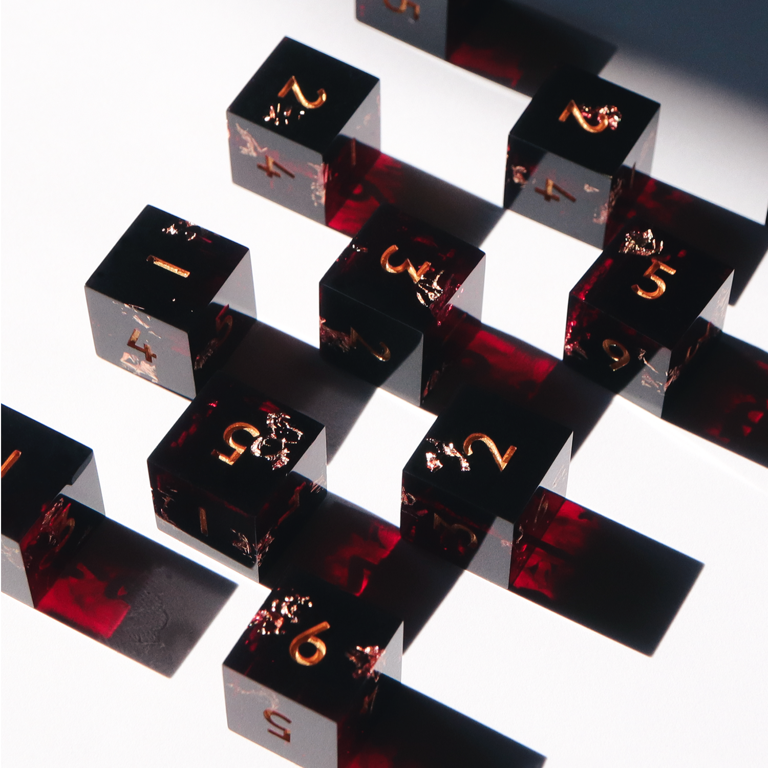 An elegant black and red smoke design with golden flake accents, inked in shimmery bronze-gold. This set includes six d6 dice.