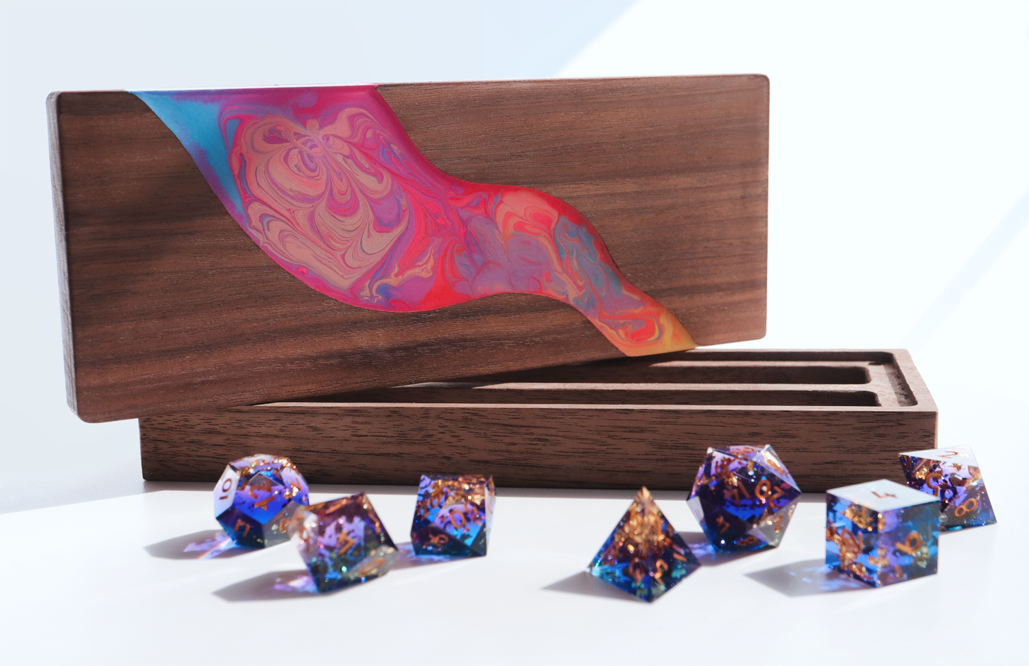 Our vaults are made with black walnut wood and hand-poured resin, with felt-lined interiors and magnetic closures. Both variants hold dice up to 25mm. The lid can be used as a rolling tray.