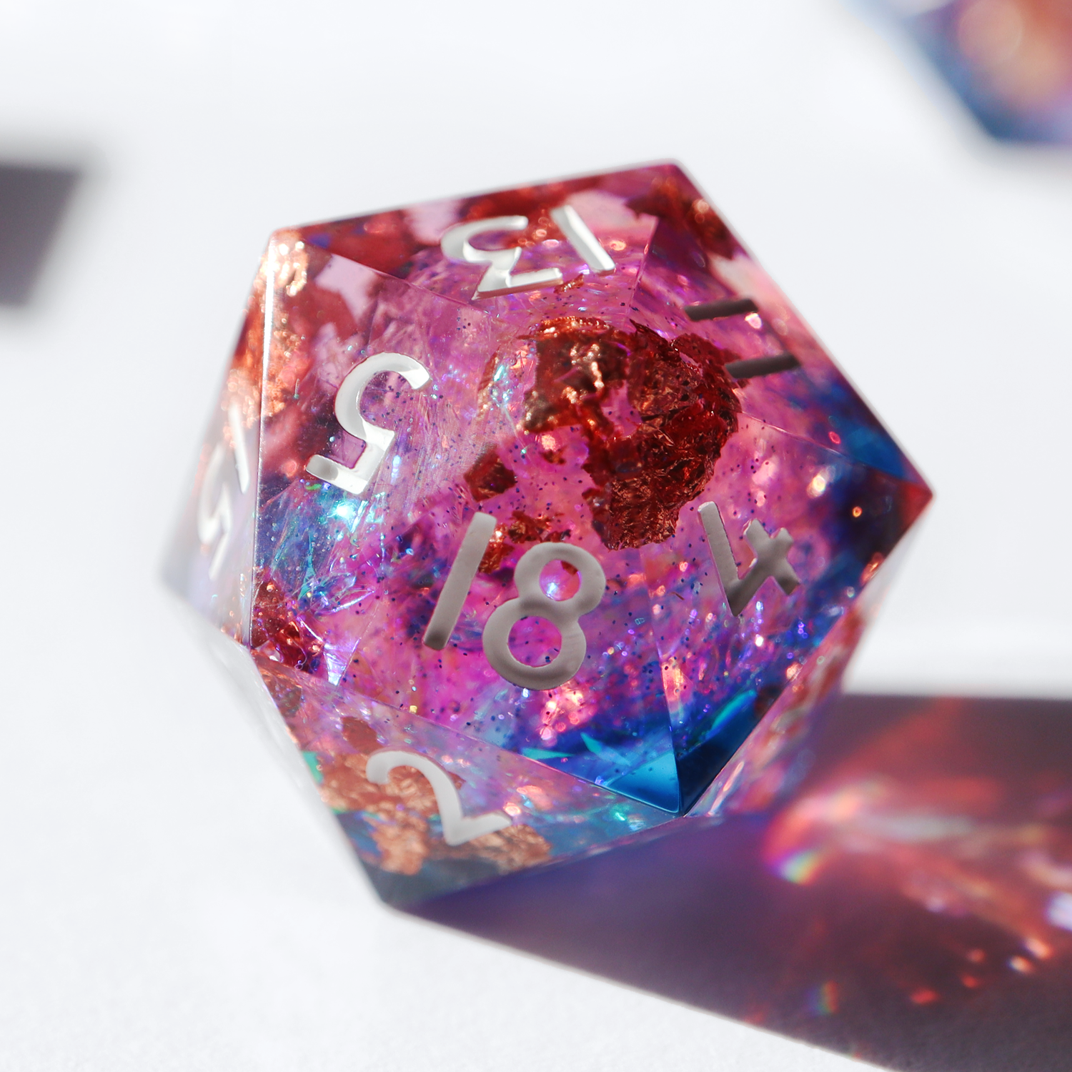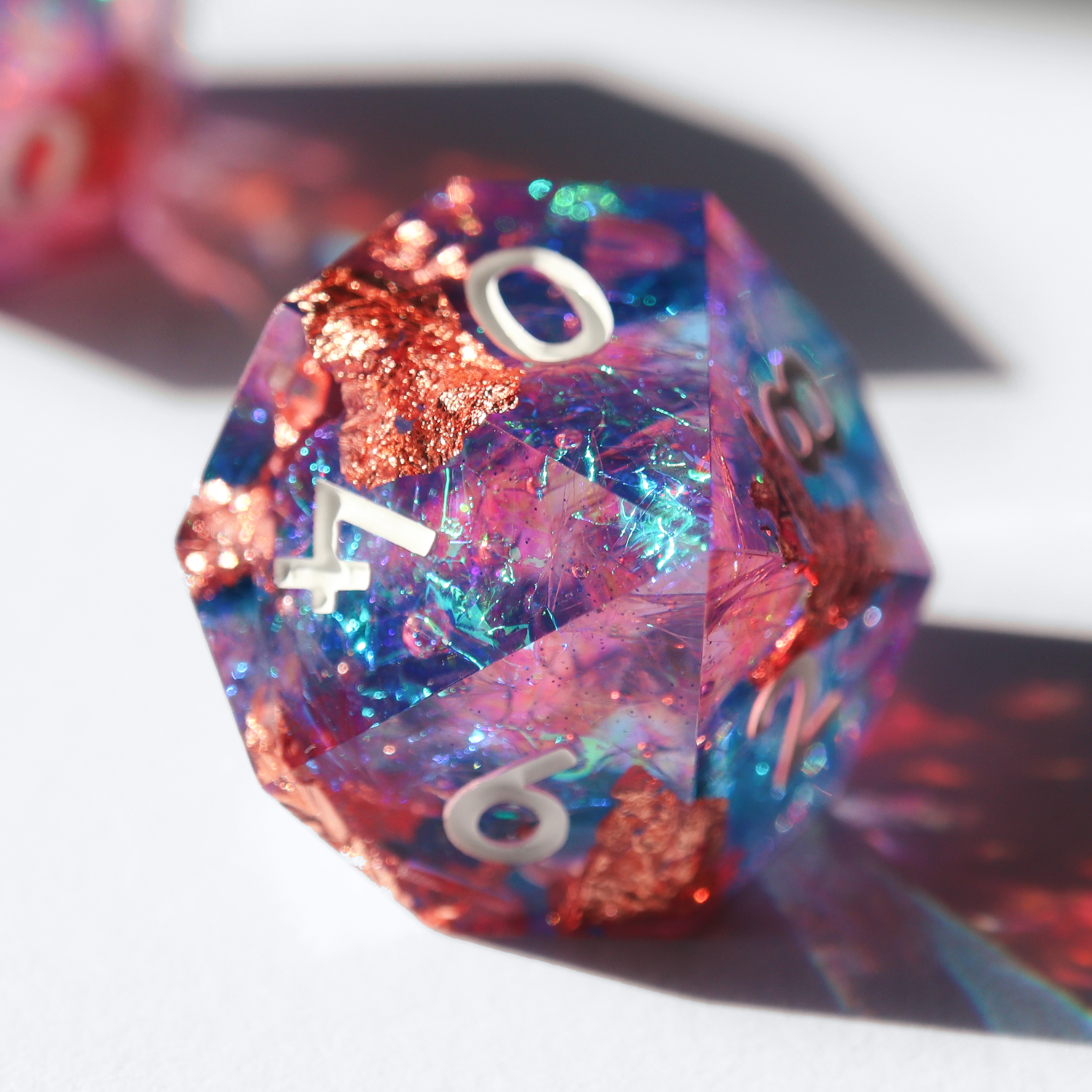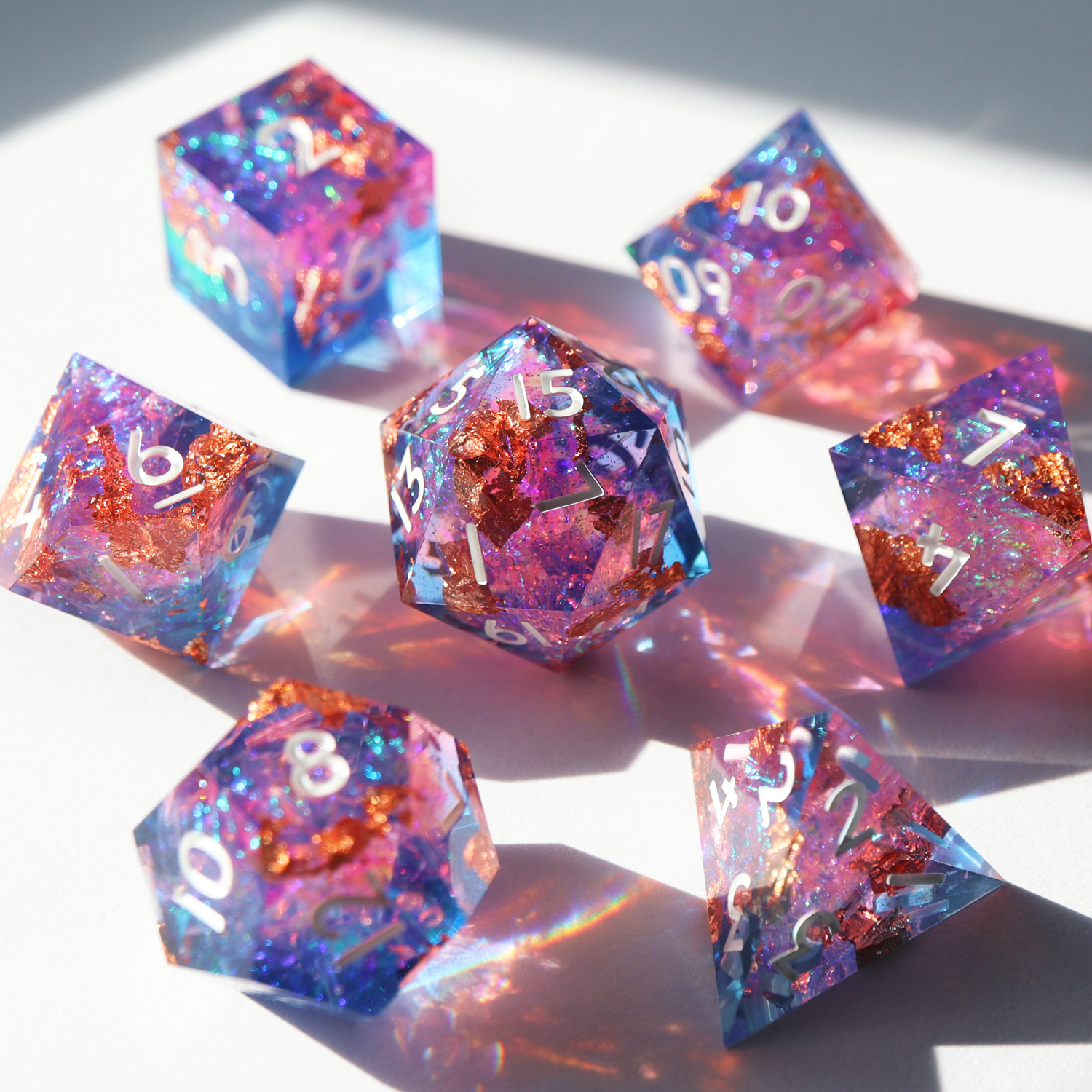A colorful supersaturated design with rose gold foil and glitter inclusions. This set includes one D4, D6, D8, D10, D%, D12, and D20.