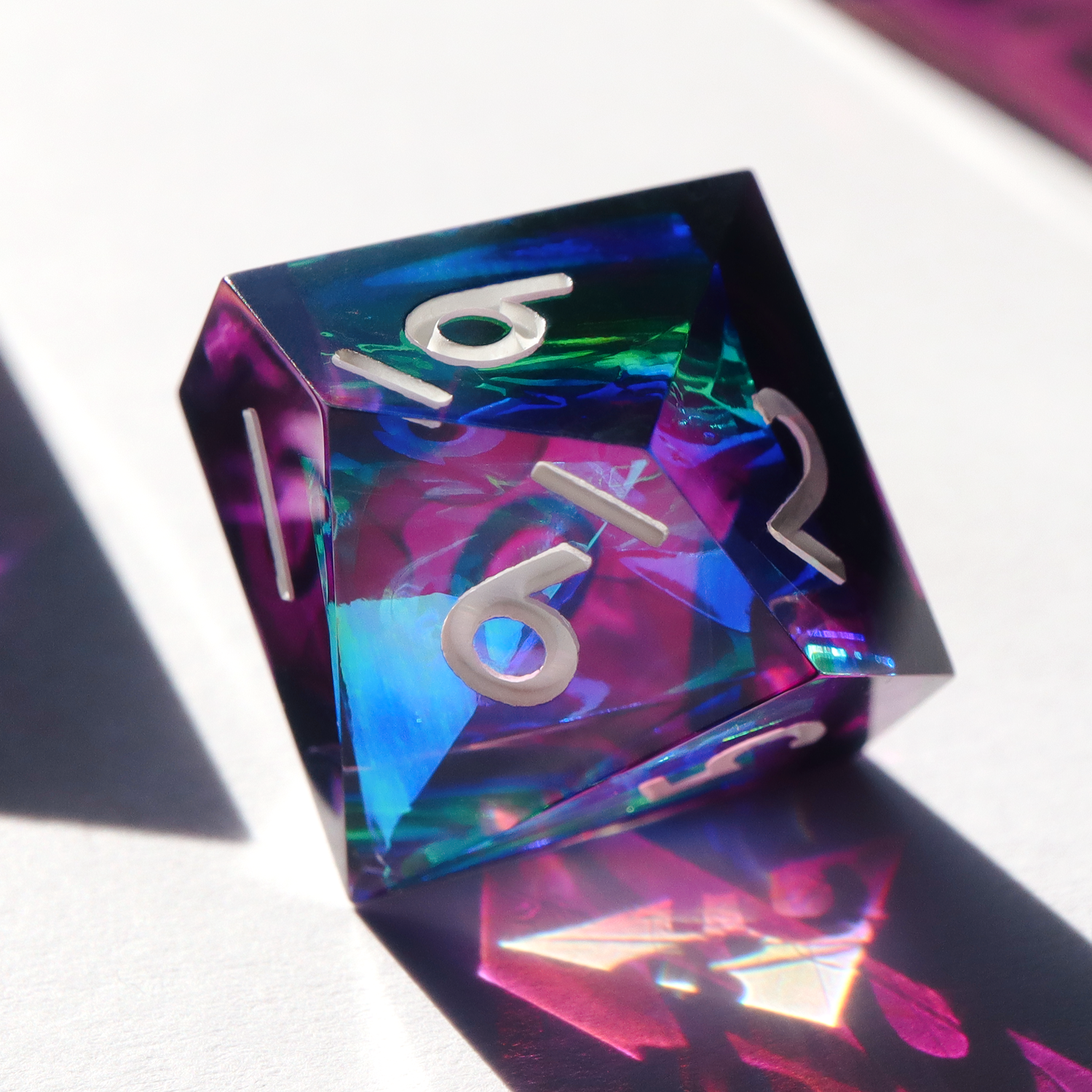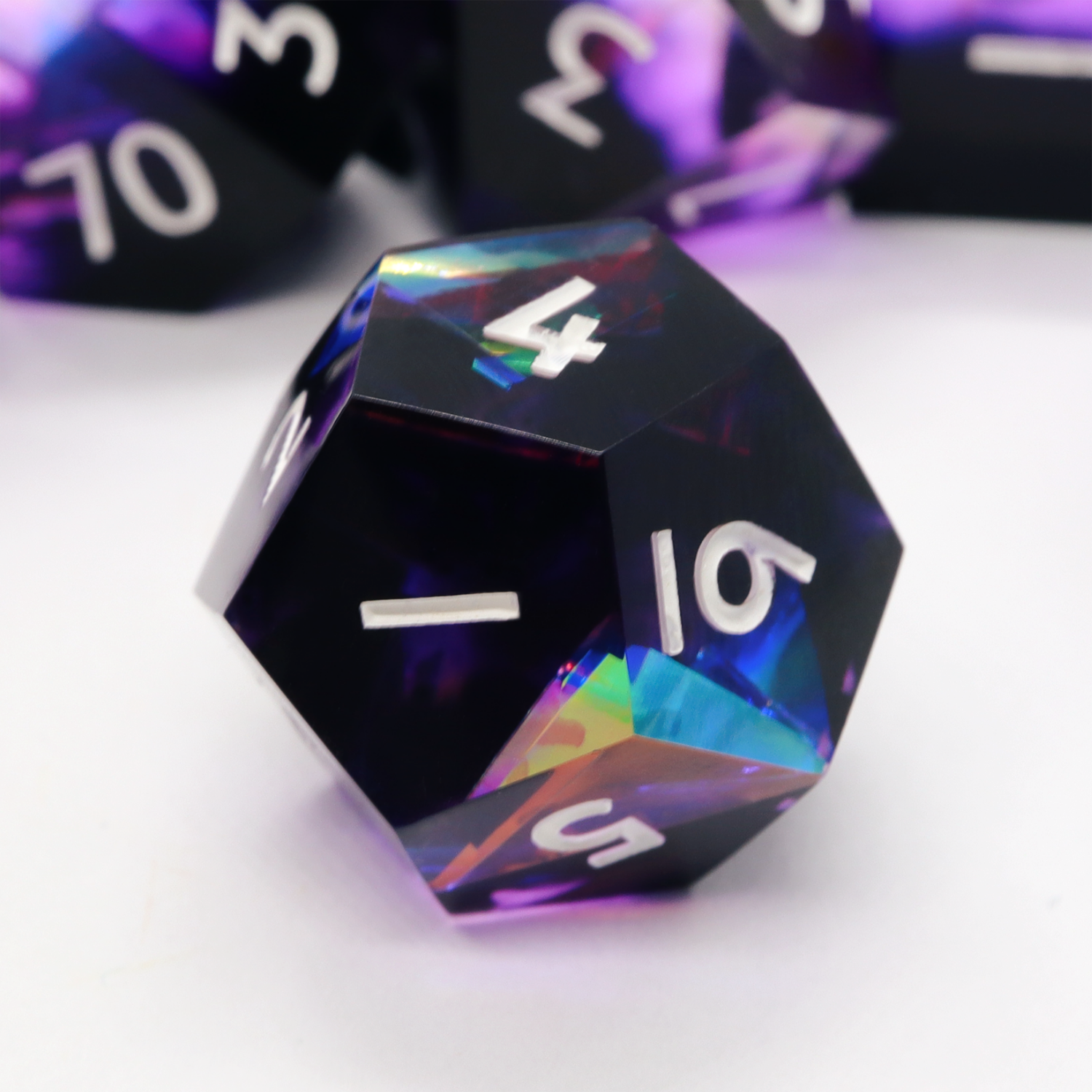A brilliant, flashy design featuring holographic paper in clear-purple-black ombre resin. This set includes one D4, D6, D8, D10, D%, D12, and D20.