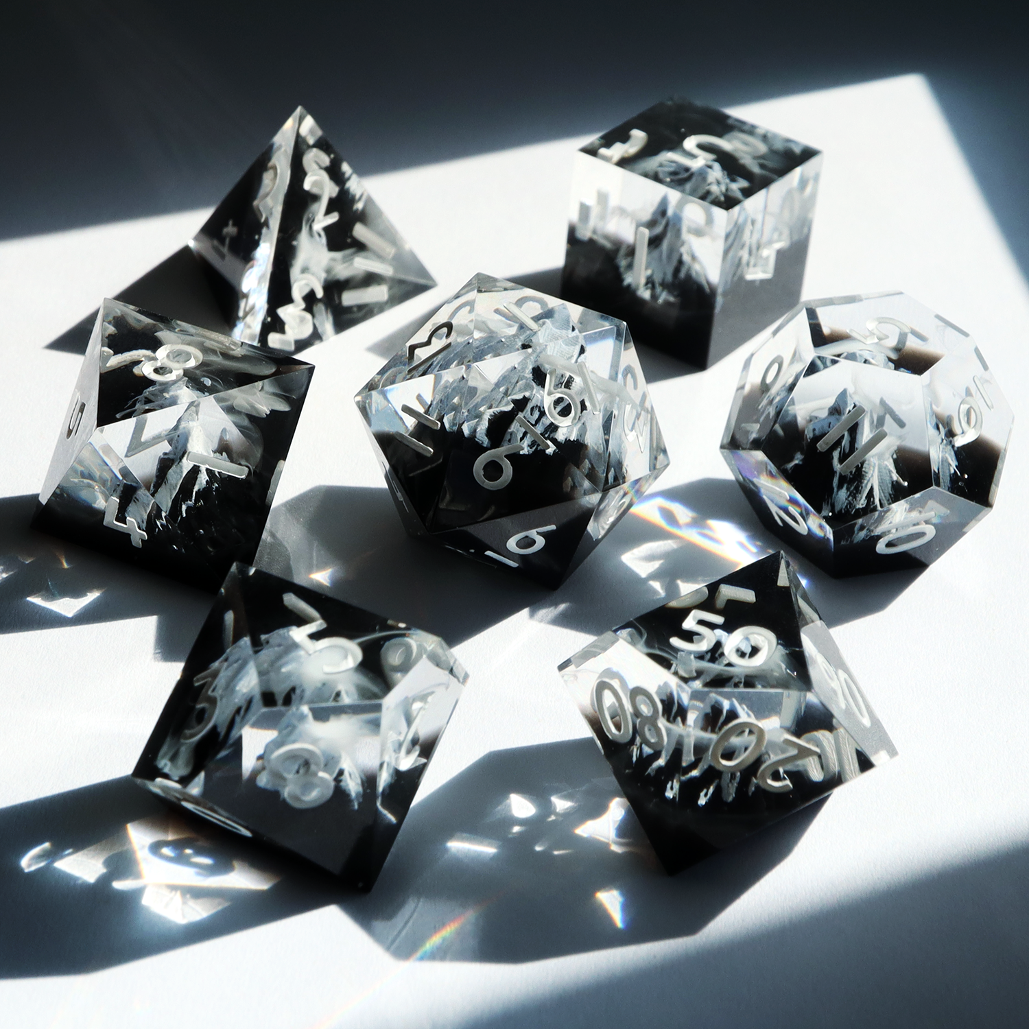 All sets sold by Everything Dice are handmade by our team of skilled resin artists, and quality-inspected to be visually perfect and suitable for casual play. Because of the handmade nature of our dice, each set will vary slightly in color proportions and inclusion placement.