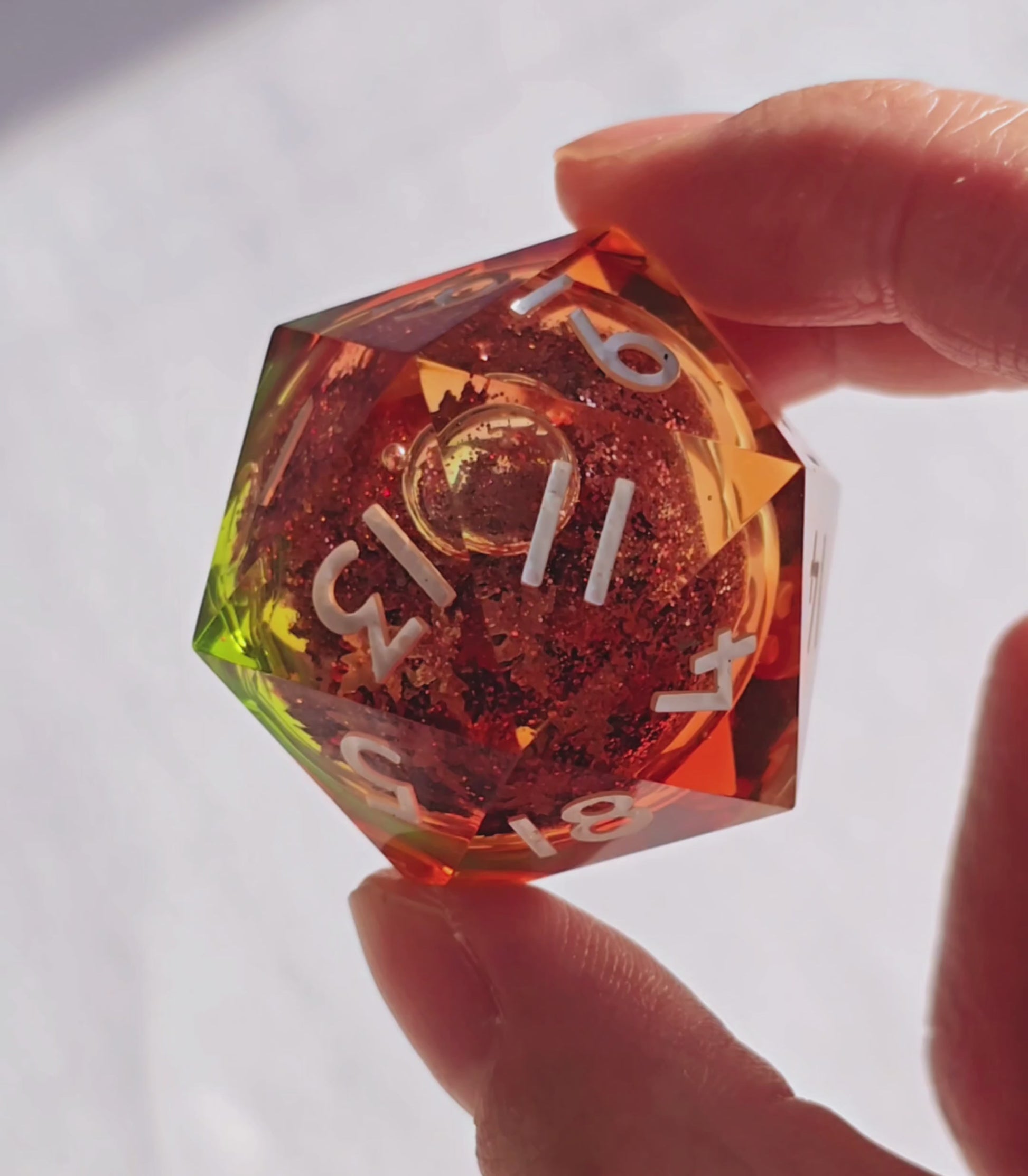 An autumnal design with maple leaf inclusions. This is an oversized chonky 40mm d20, twice the size of a normal d20! The video shows the dice both in sunlight and standard room lighting.
