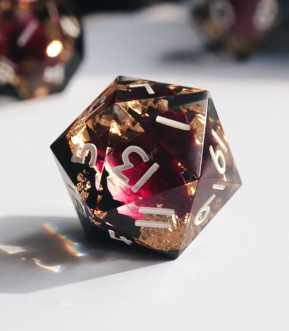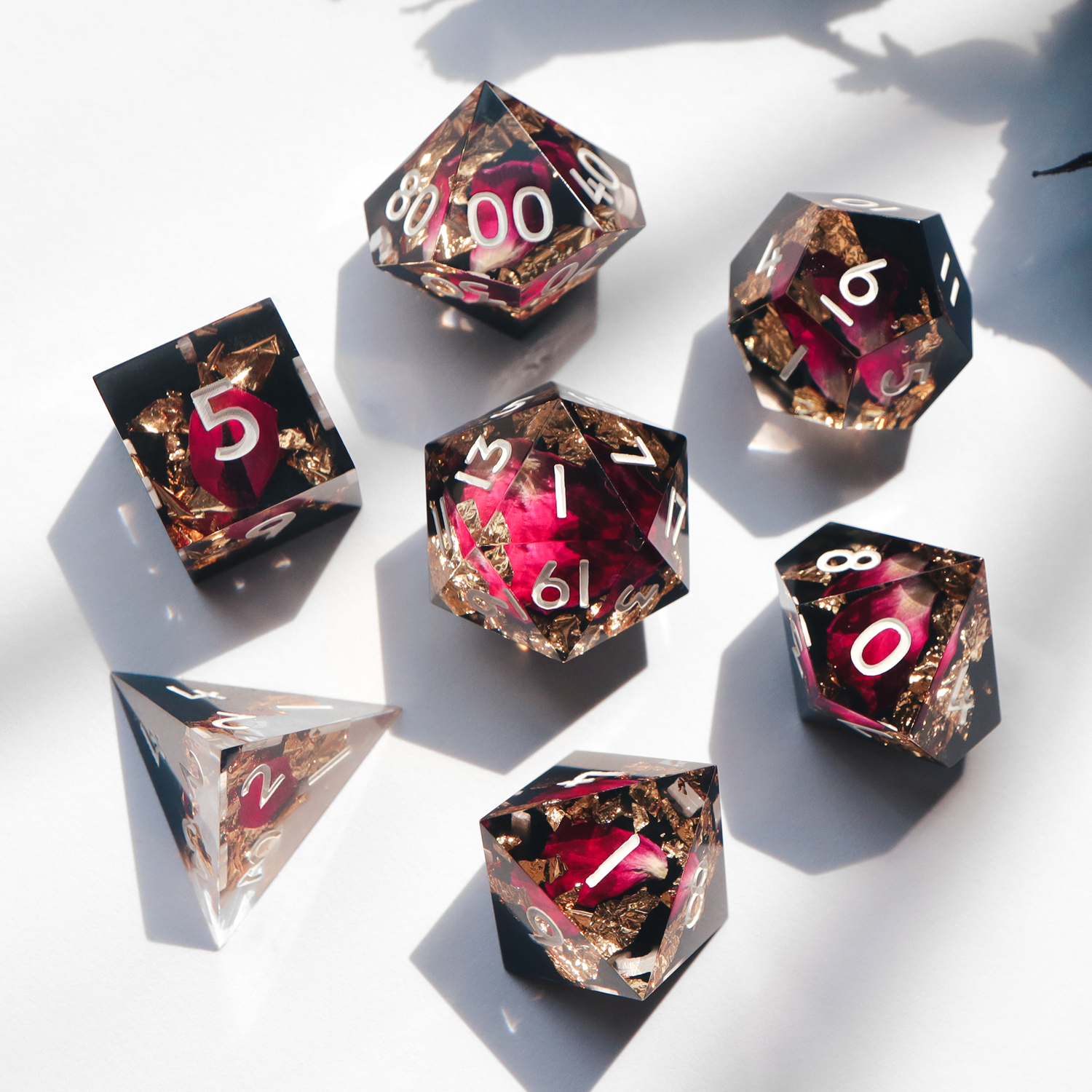 A half clear, half black design with real rose petals and gold foil. This set includes one D4, D6, D8, D10, D%, D12, and D20.