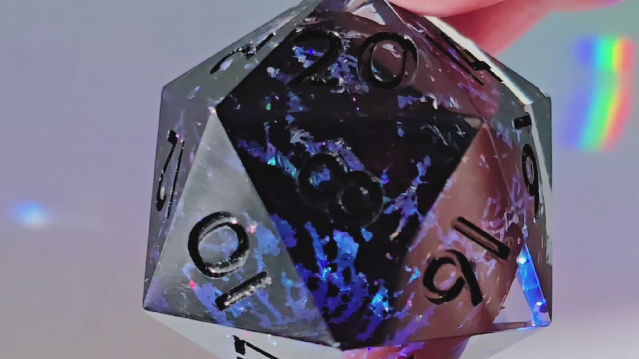 This is an oversized chonky 40mm d20, twice the size of a normal d20! The video shows the dice both in sunlight and standard room lighting.