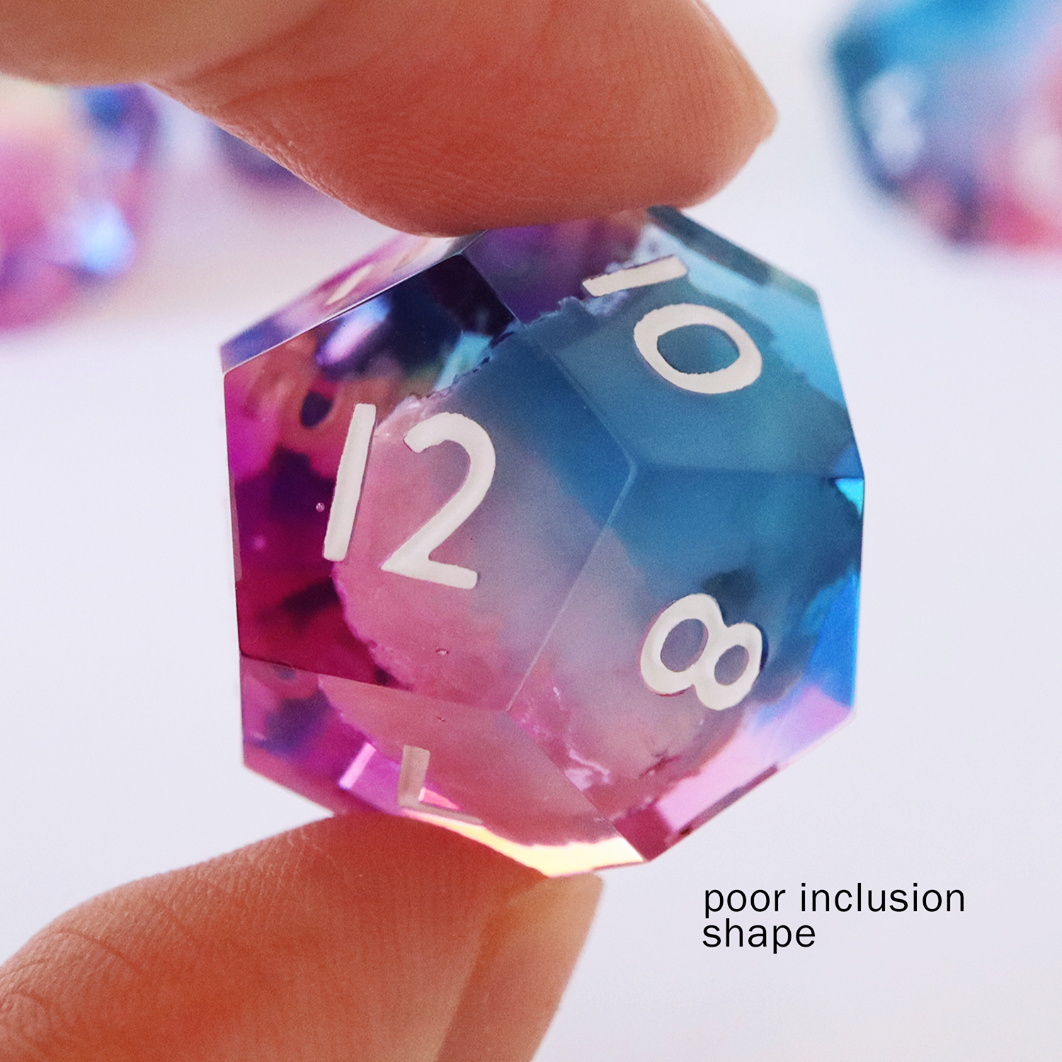 - Inclusions touching the surface - the cloud inclusion sometimes touches the surface of the dice. This is only a cosmetic imperfection and does not affect rolls.