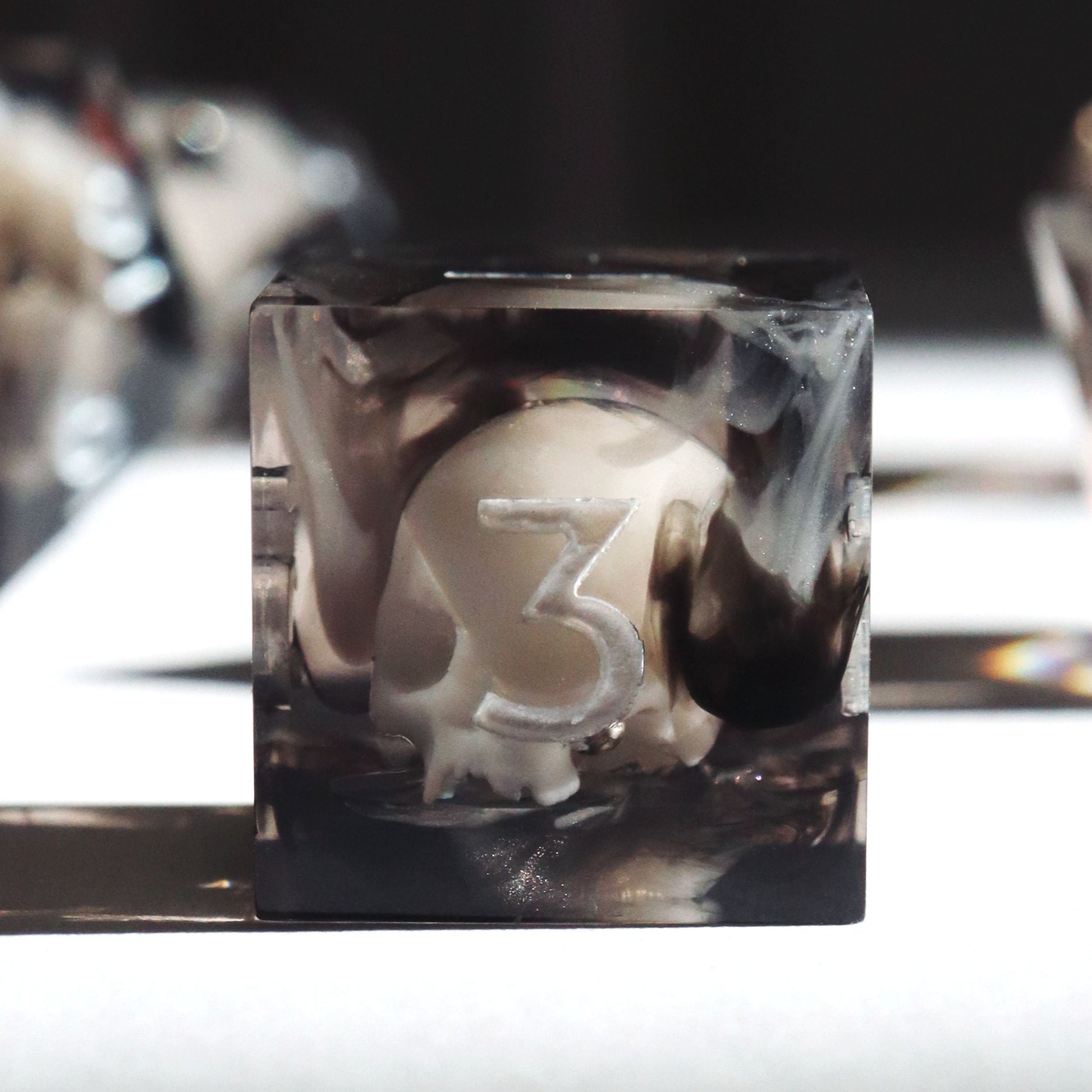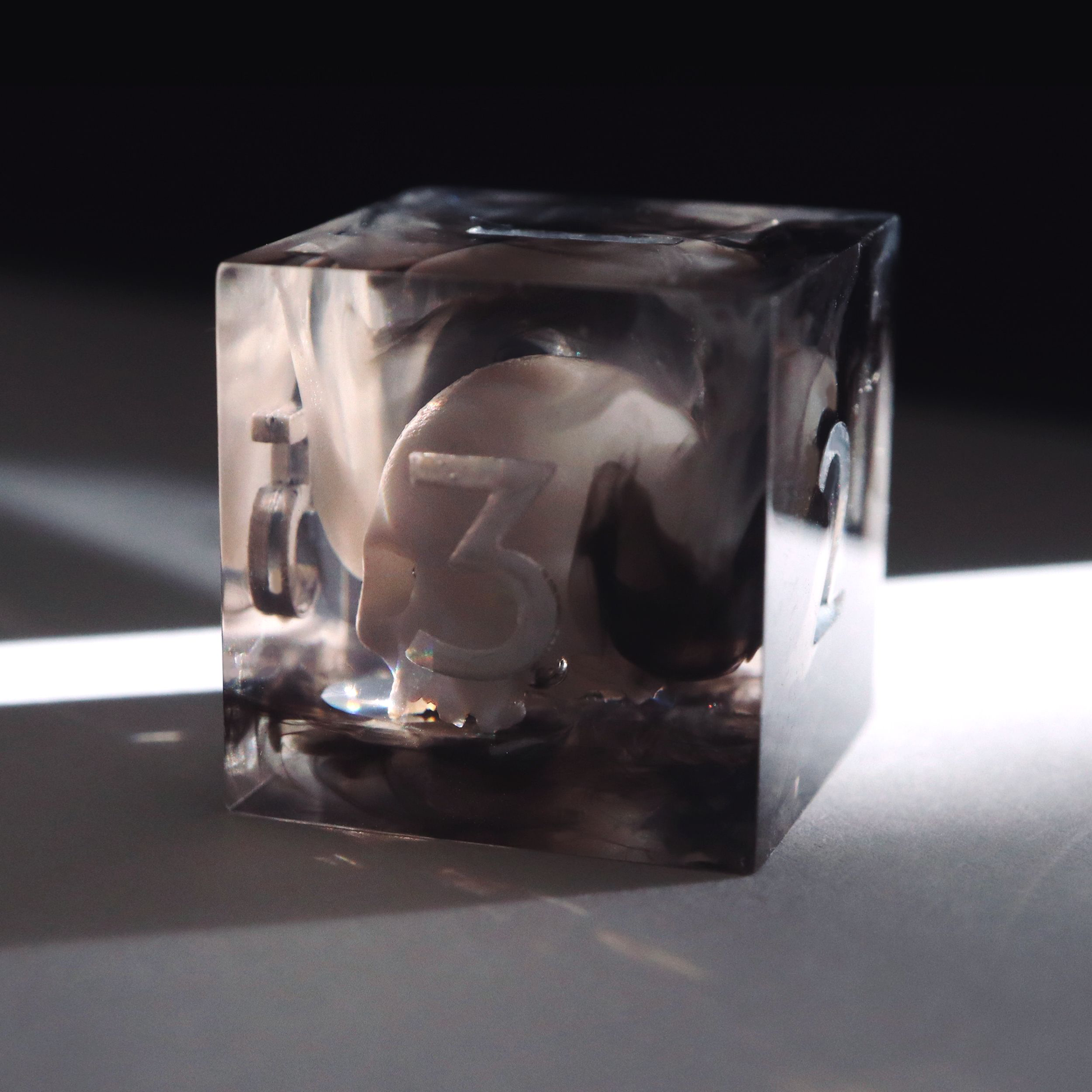 A gloomy design, featuring a skull in the center surrounded by wisps of white and black smoke. NOTE: the skulls in this design are cast in resin and has the same density as the clear portions - the design is still balanced for casual play use!