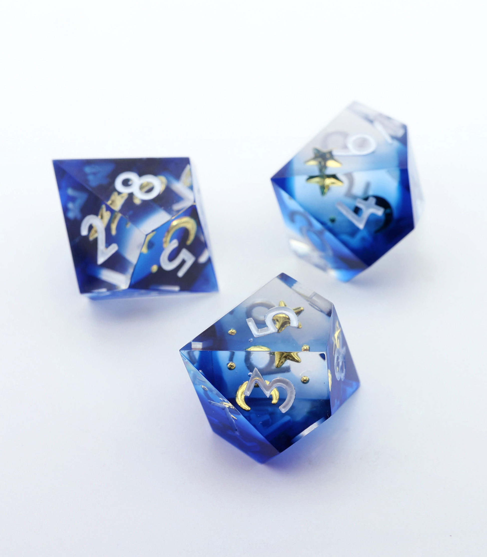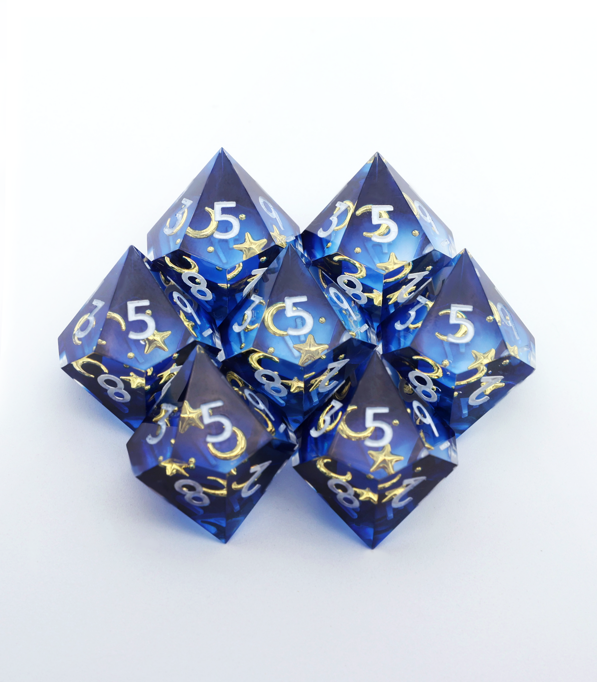 An asymmetric design with star and moon inclusions against an inky royal blue night sky. This is a D10 ONLY set!