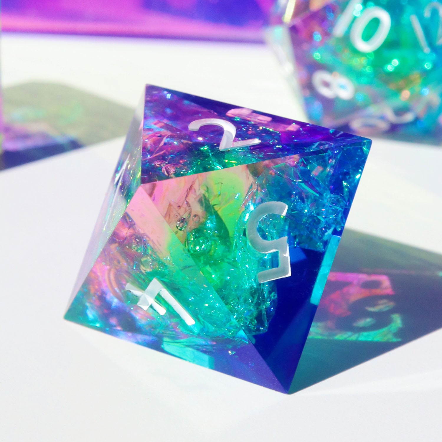 This set includes one D4 (Crystal shape), D6, D8, D10, D%, D12, and D20.