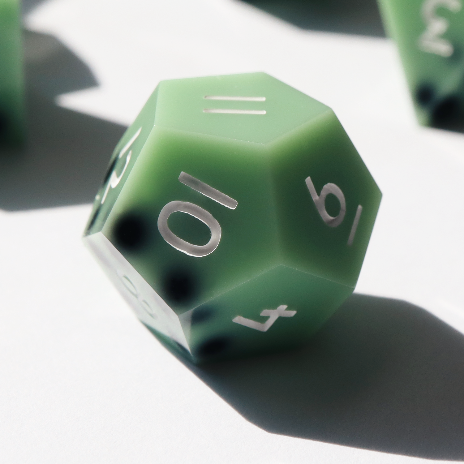 All sets sold by Everything Dice are handmade by our team of skilled resin artists, and quality-inspected to be visually perfect and suitable for casual play. Because of the handmade nature of our dice, each set will vary slightly in inclusion placement.
