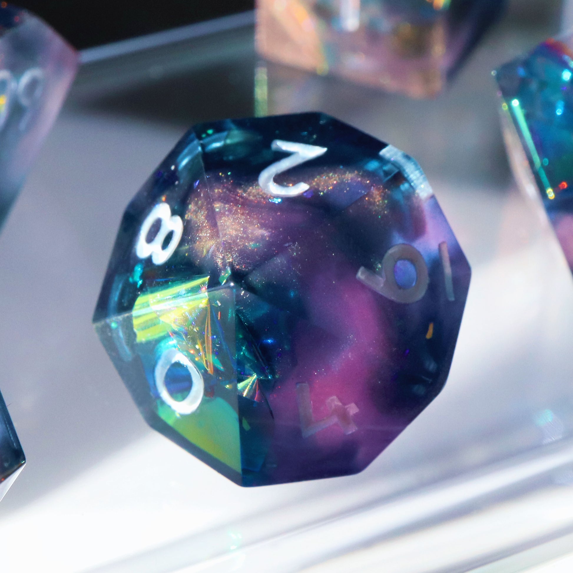 All sets sold by Everything Dice are handmade by our team of skilled resin artists, and quality-inspected to be visually perfect and suitable for casual play. Because of the handmade nature of our dice, each set will vary slightly in color proportions and inclusion placement.