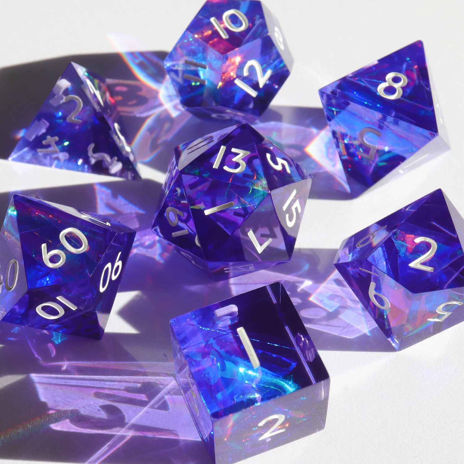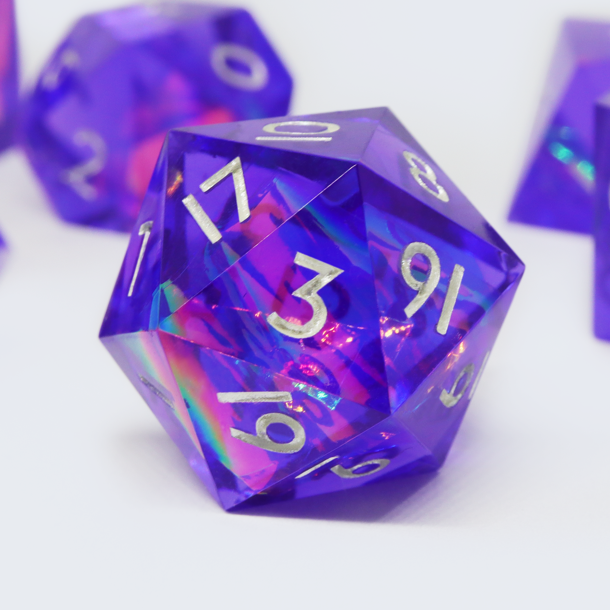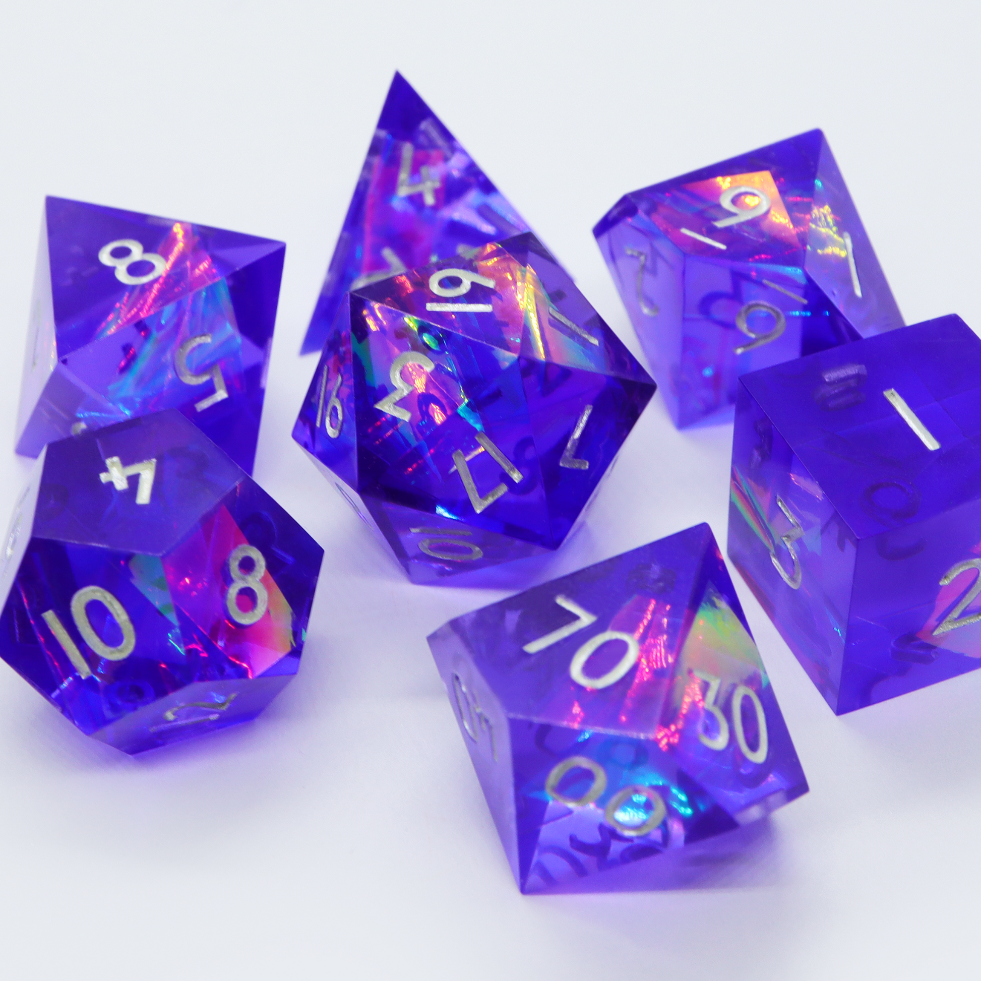 A brilliant, flashy design featuring holographic paper in purple resin, inspired by 80s retrowave design. This set includes one D4, D6, D8, D10, D%, D12, and D20.