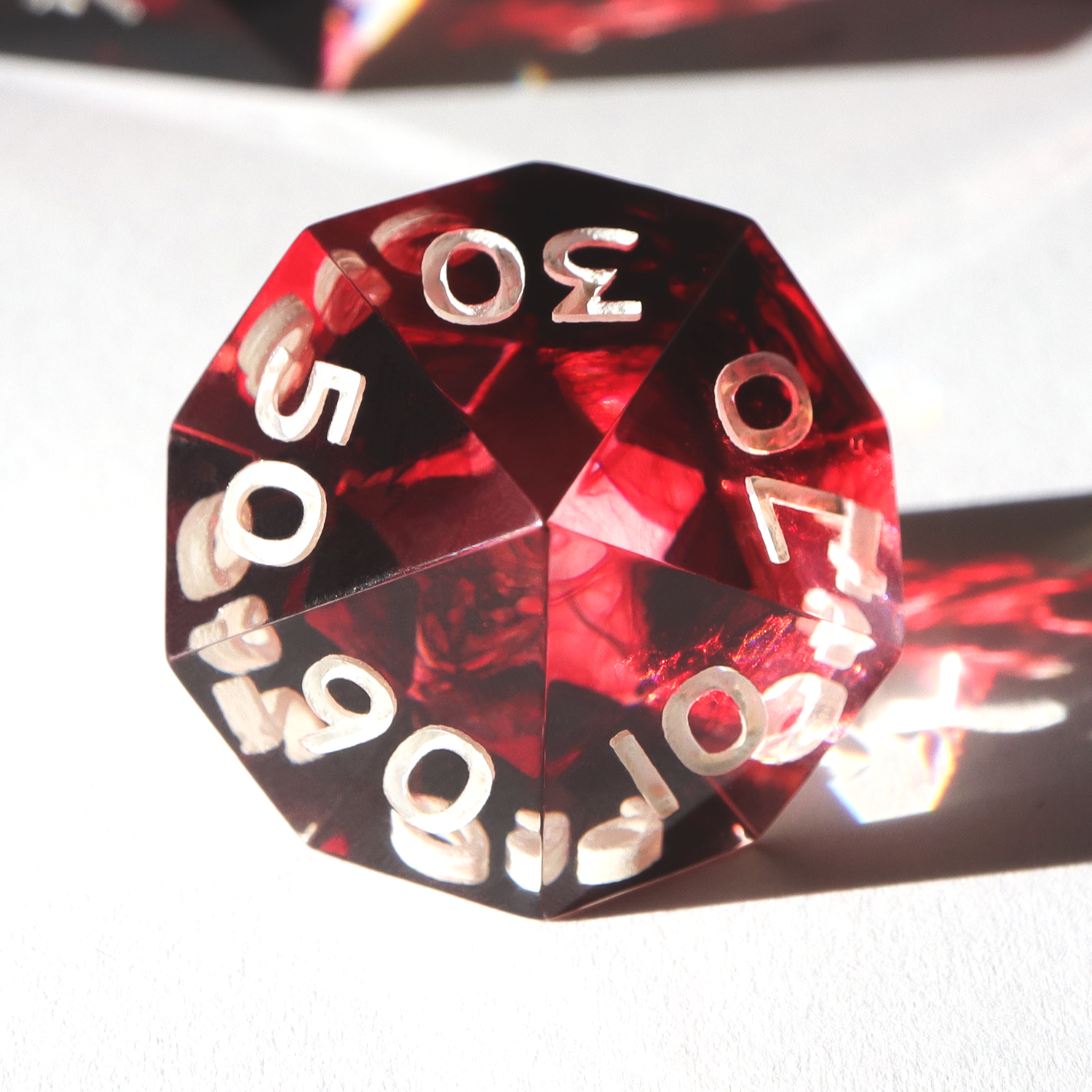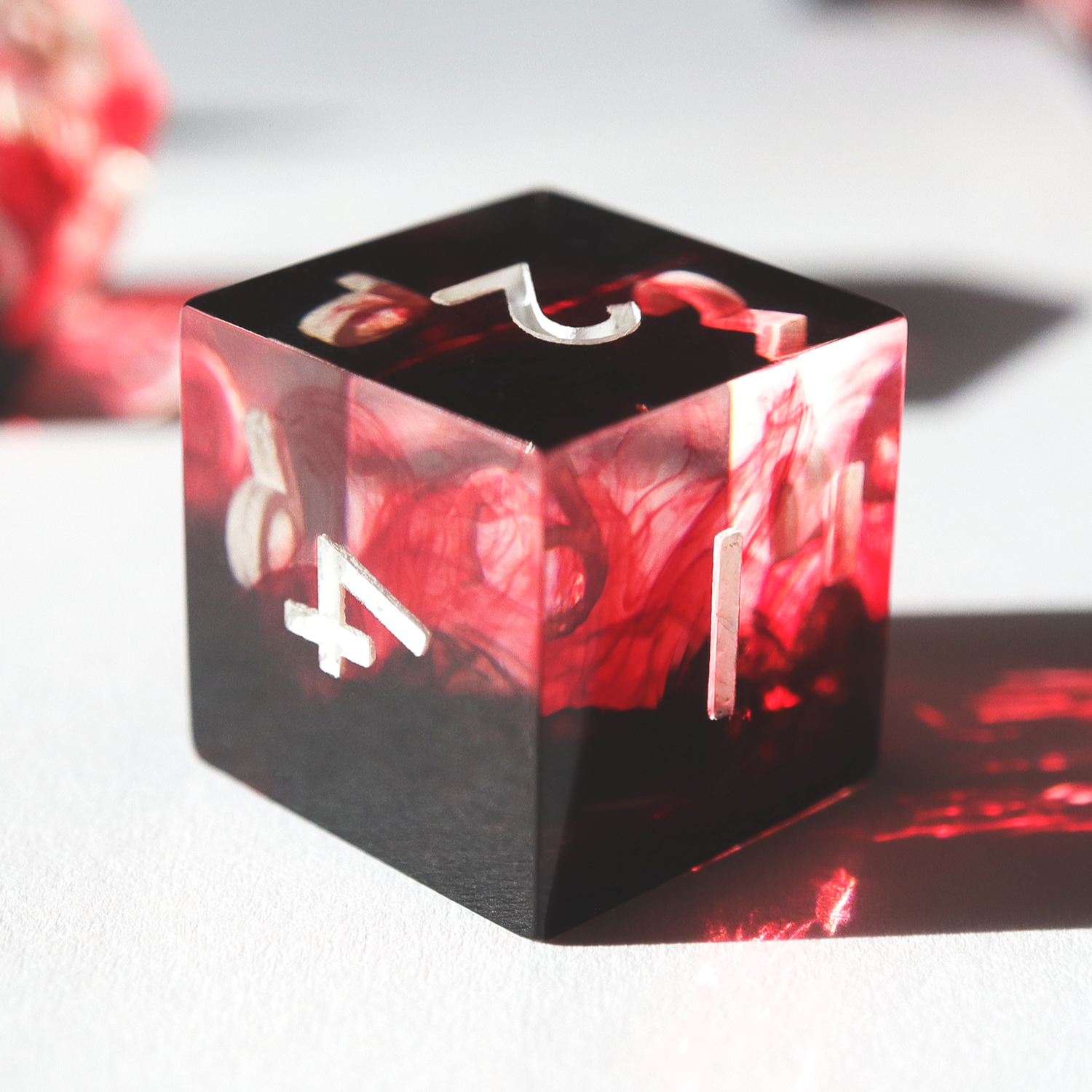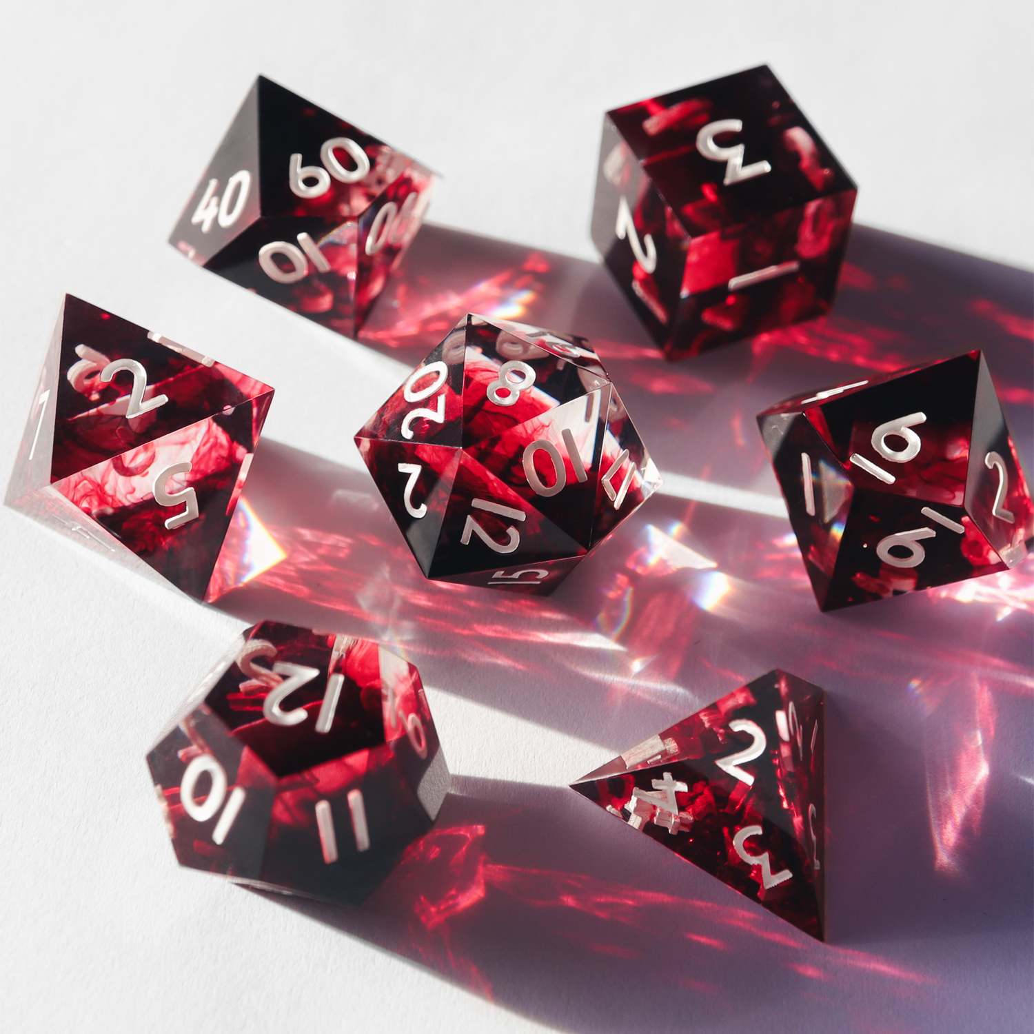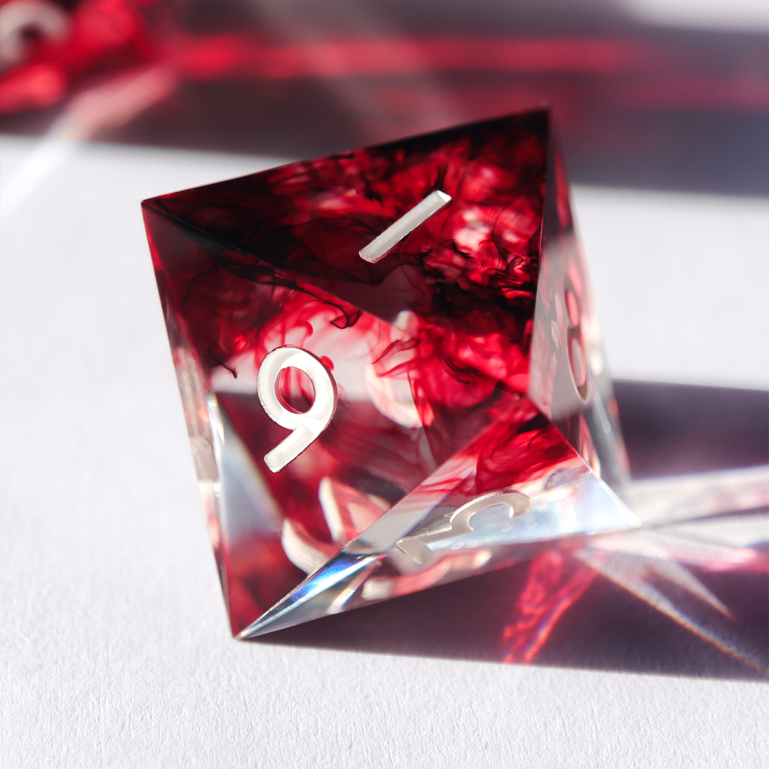 An ominous, bloody gradient of red encapsulated in clear dice. This set includes one D4, D6, D8, D10, D%, D12, and D20.