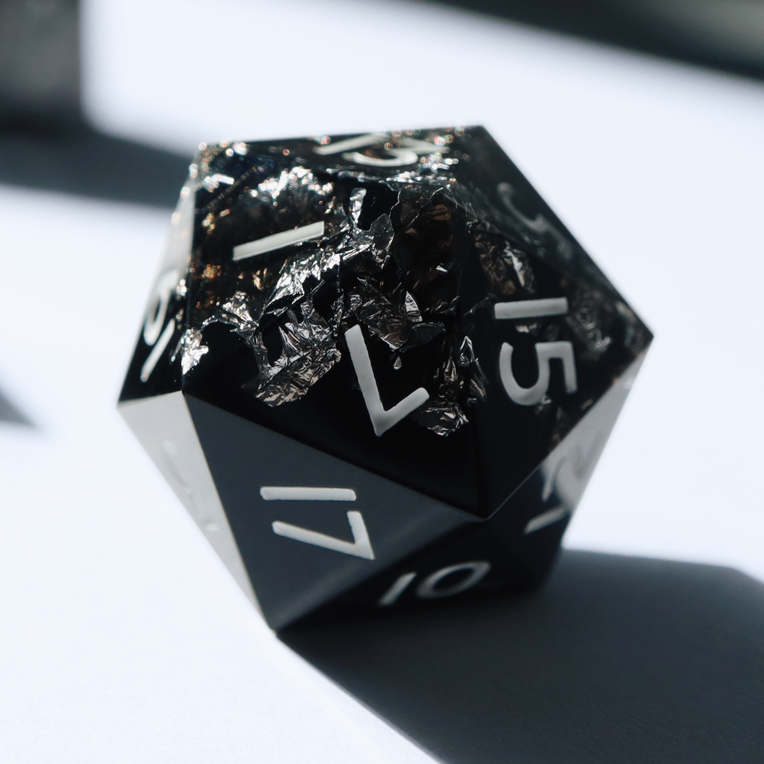 A minimalistic opaque black set half encased in silver foil, mimicking the texture of snow obsidian. This is for ONE single d20.