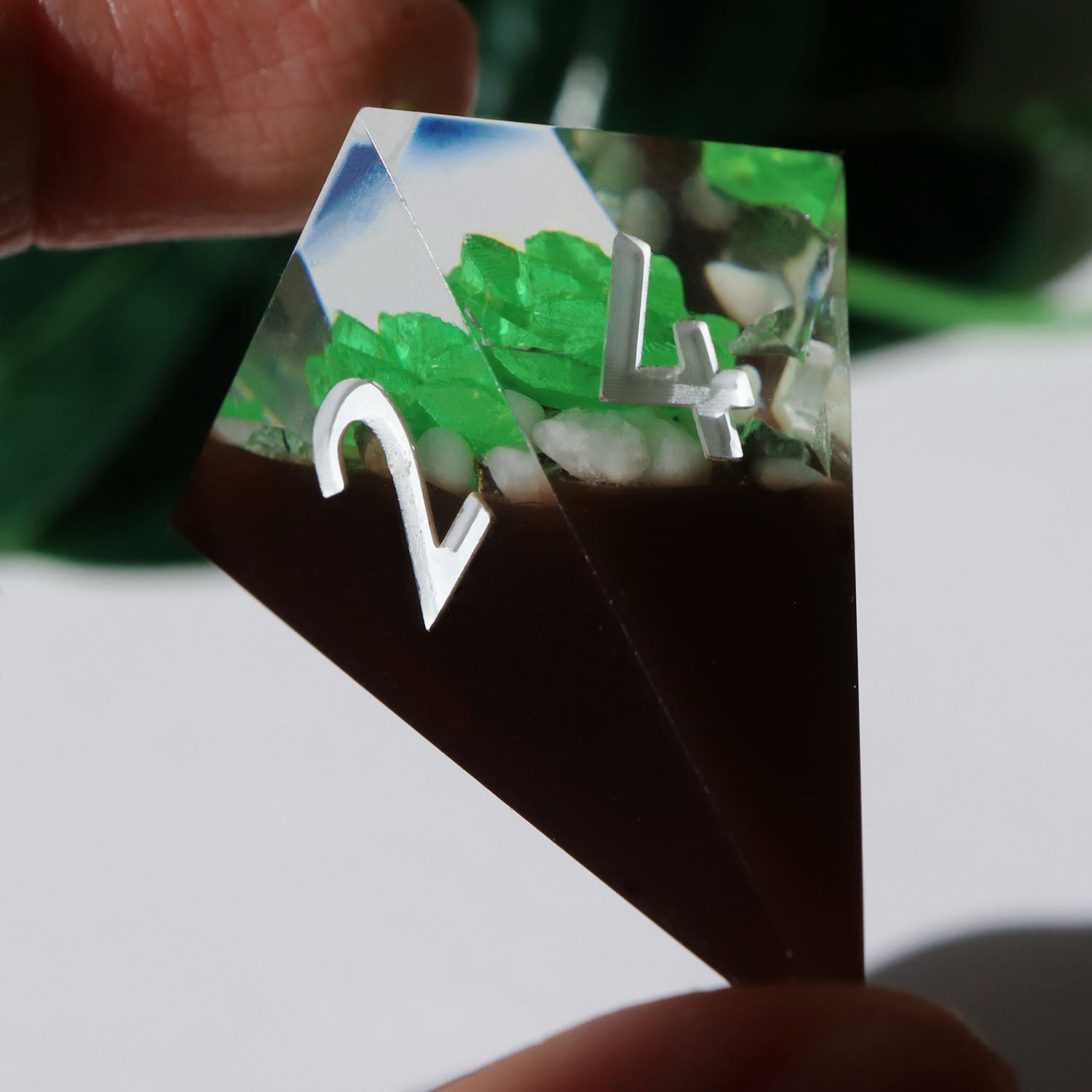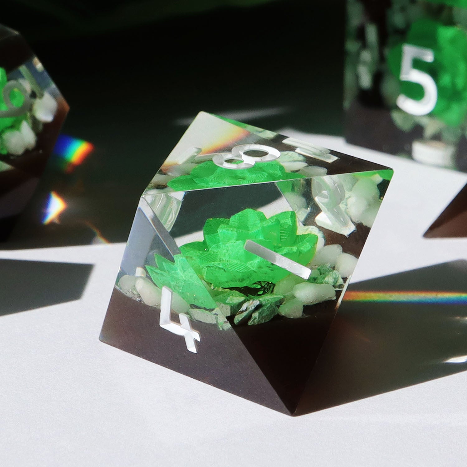 All sets sold by Everything Dice are handmade by our team of skilled resin artists, and quality-inspected to be visually perfect and suitable for casual play. Because of the handmade nature of our dice, each set will vary slightly in color proportions and inclusion placement.