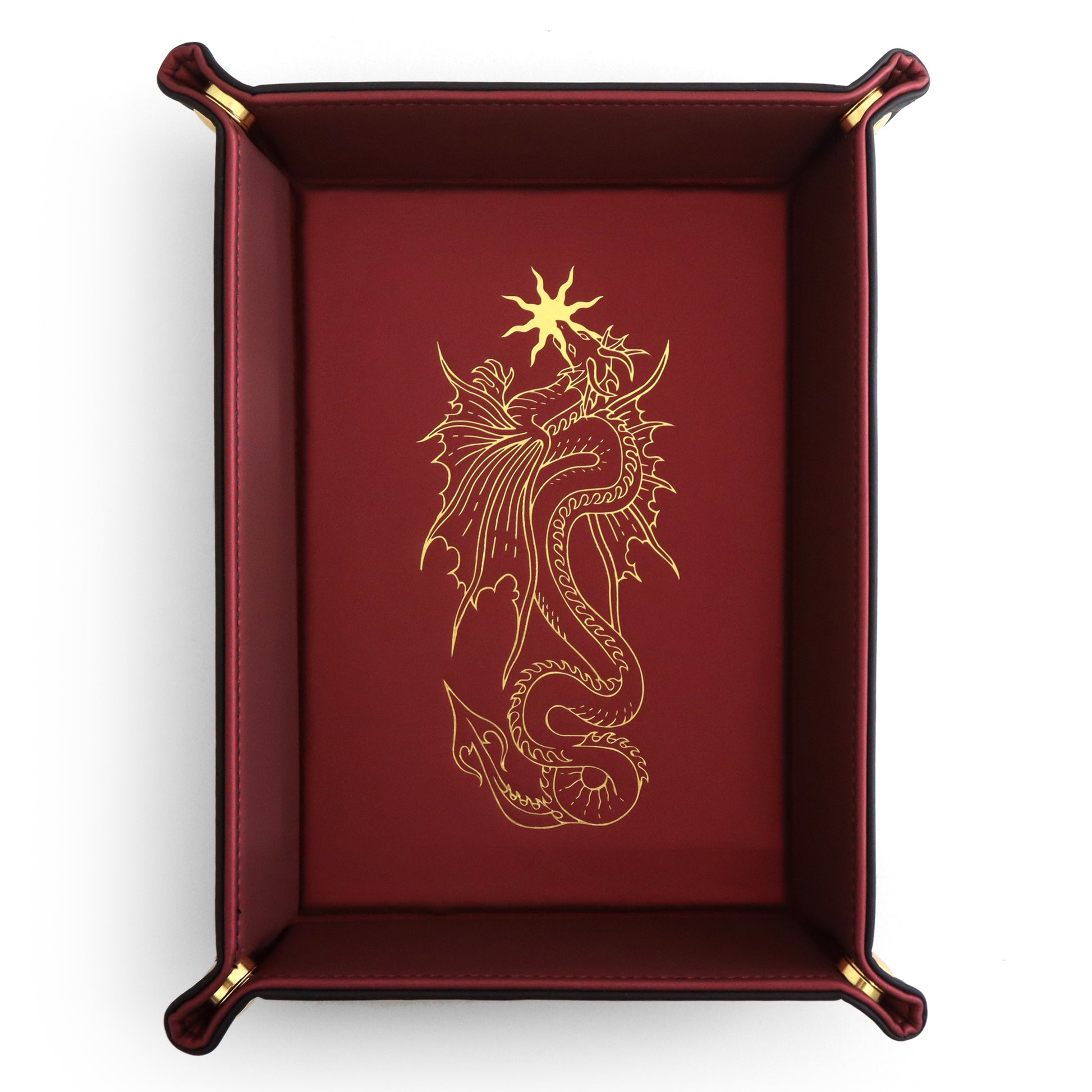 Roll in style with this matte ruby PU vegan leather dice tray with custom gold embossed artwork by Everything Dice! This tray is made of two layers of PU leather with gold magnetic closures.