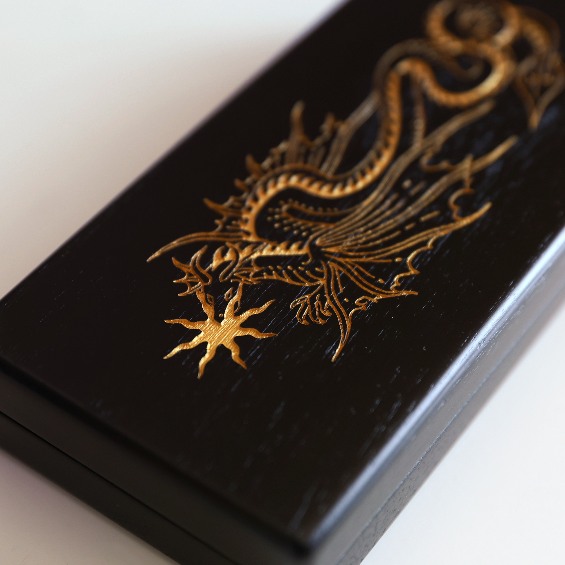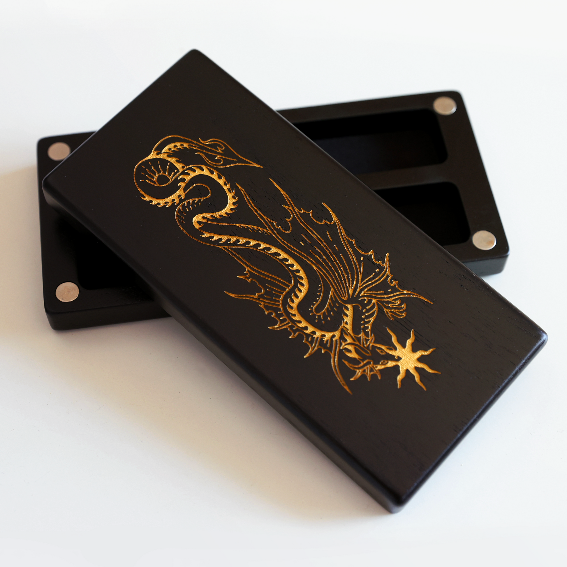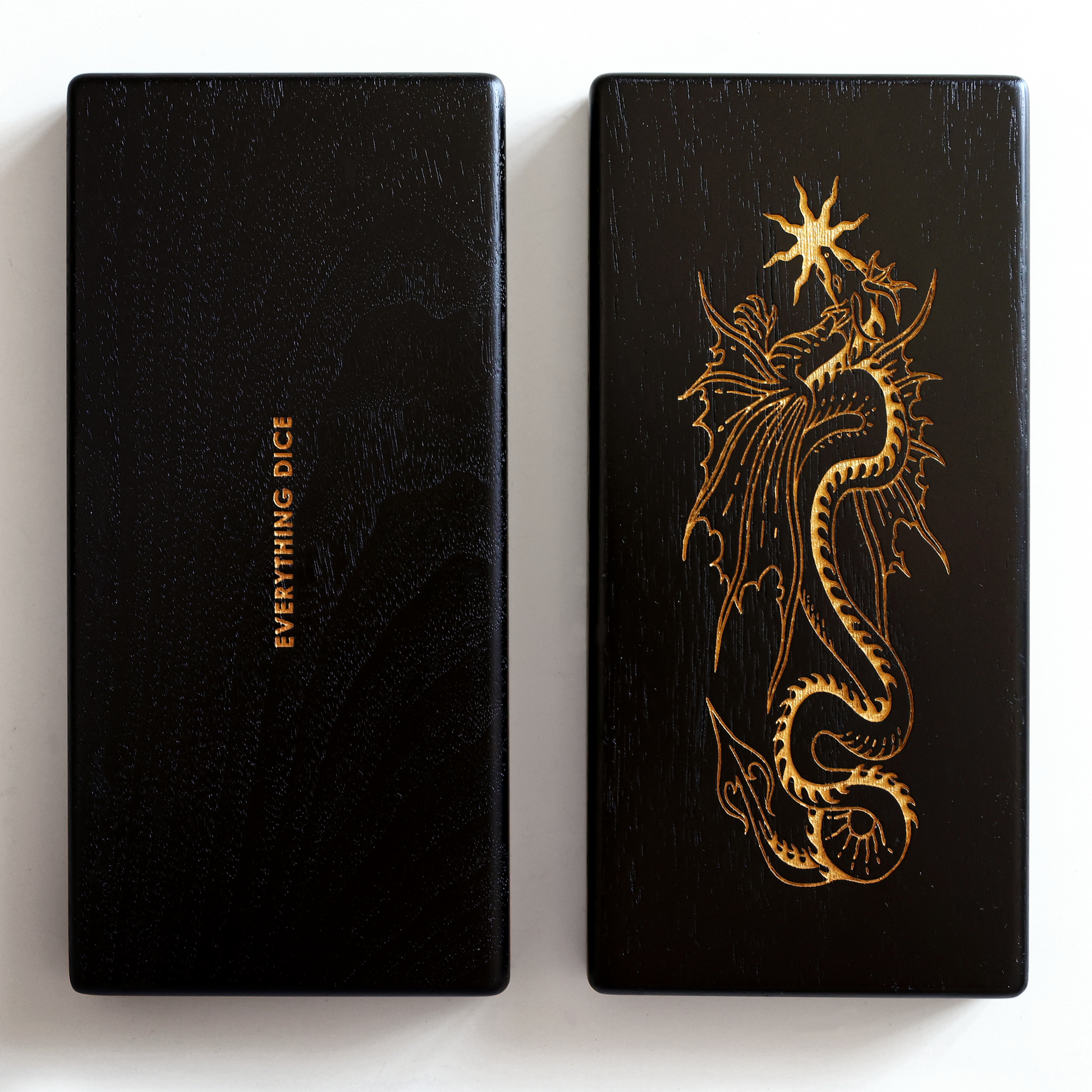 Protect your dice in this elegant vault, featuring etched custom artwork. Our vaults are made out of black walnut wood with magnetic clasps and black velvet lining. All vaults come shipped with a protective velvet bag.
